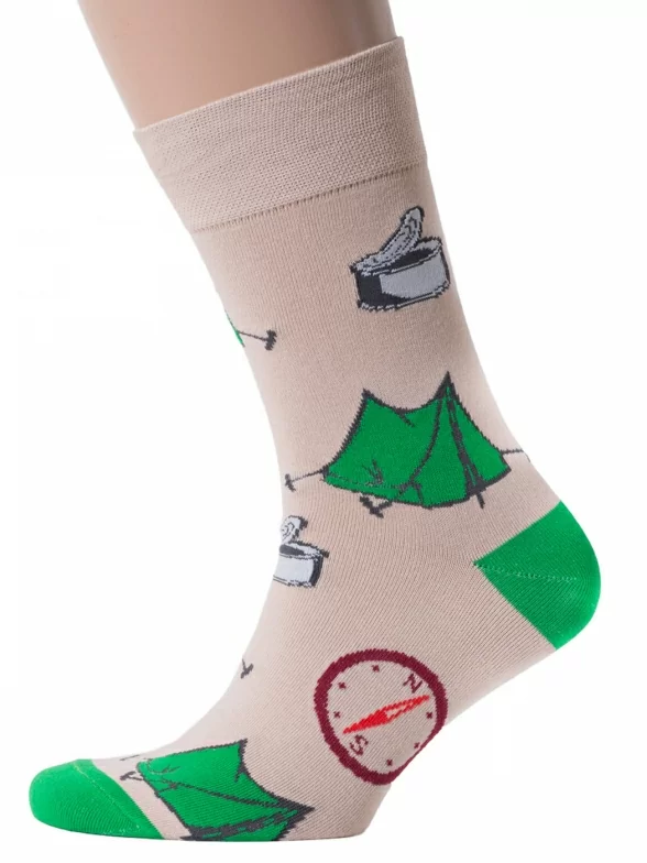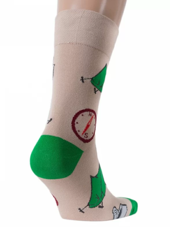 Круглогодичные средней длины мужские носки, цвет бежевый-многоцветные (мультиколор), повседневные, шов обычный (не бесшовные), принт (рисунок): крупные контрастные рисунки, с узором, ностальгия, путешествия, состав: 82% хлопок, 15% полиамид, 3% эластан, арт. NM-81. Производитель «ИП Рыбалкин В.С., Московская область, г. Щелково» под брендом «Msclub».