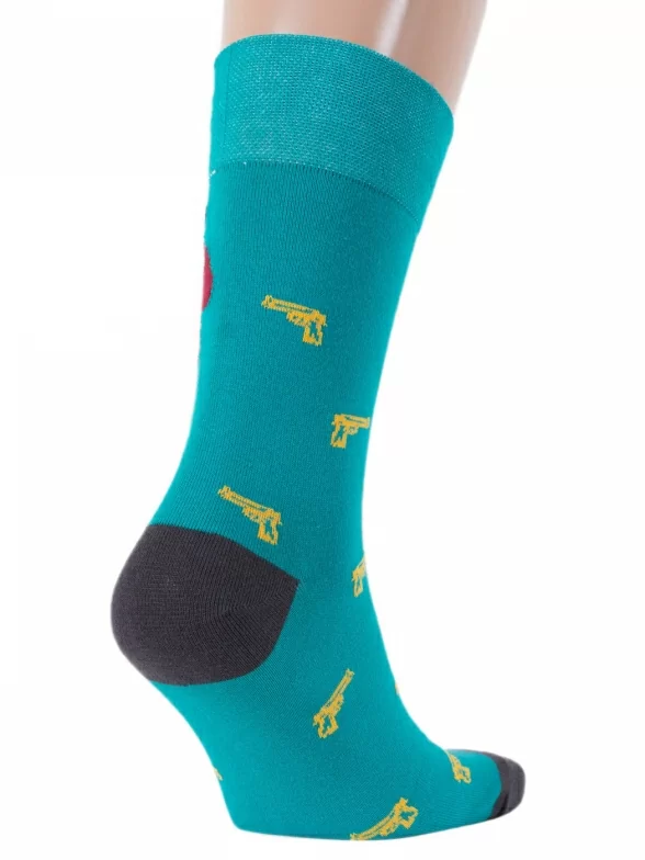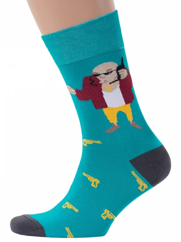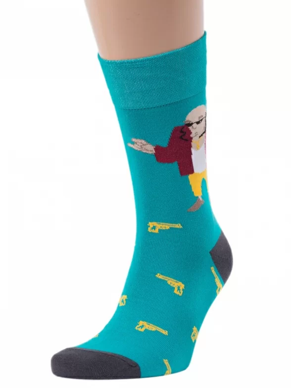 Круглогодичные средней длины мужские носки, цвет бирюзовый-многоцветные (мультиколор), повседневные, шов обычный (не бесшовные), принт (рисунок): крупные контрастные рисунки, с узором, люди, ностальгия, состав: 82% хлопок, 15% полиамид, 3% эластан, арт. NM-79. Производитель «ИП Рыбалкин В.С., Московская область, г. Щелково» под брендом «Msclub».