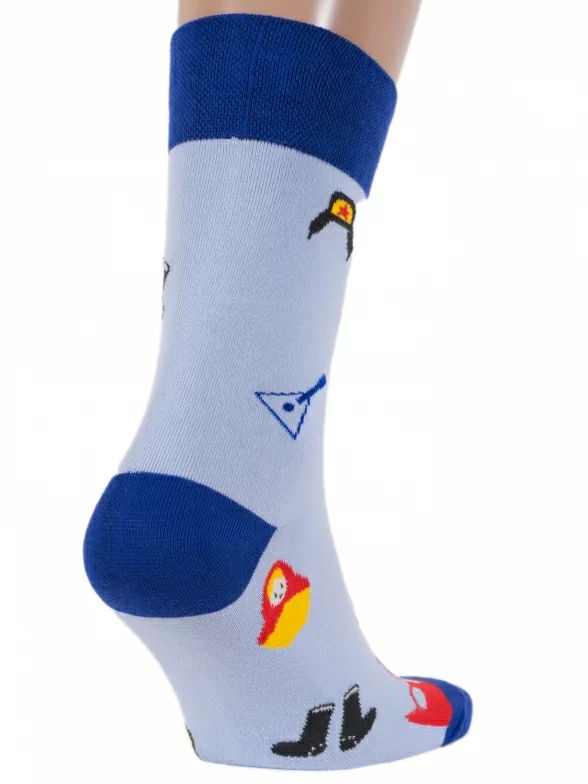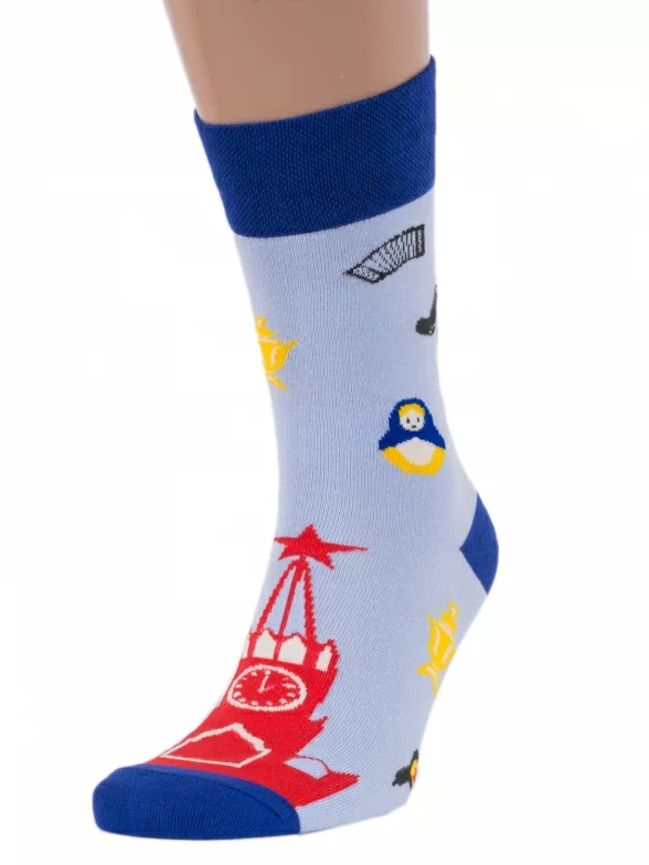 Круглогодичные средней длины мужские носки, цвет многоцветные (мультиколор)-голубой, повседневные, шов обычный (не бесшовные), принт (рисунок): путешествия, архитектура, крупные контрастные рисунки, состав: 82% хлопок, 15% полиамид, 3% эластан, арт. Nm-71. Производитель «ИП Рыбалкин В.С., Московская область, г. Щелково» под брендом «Msclub».