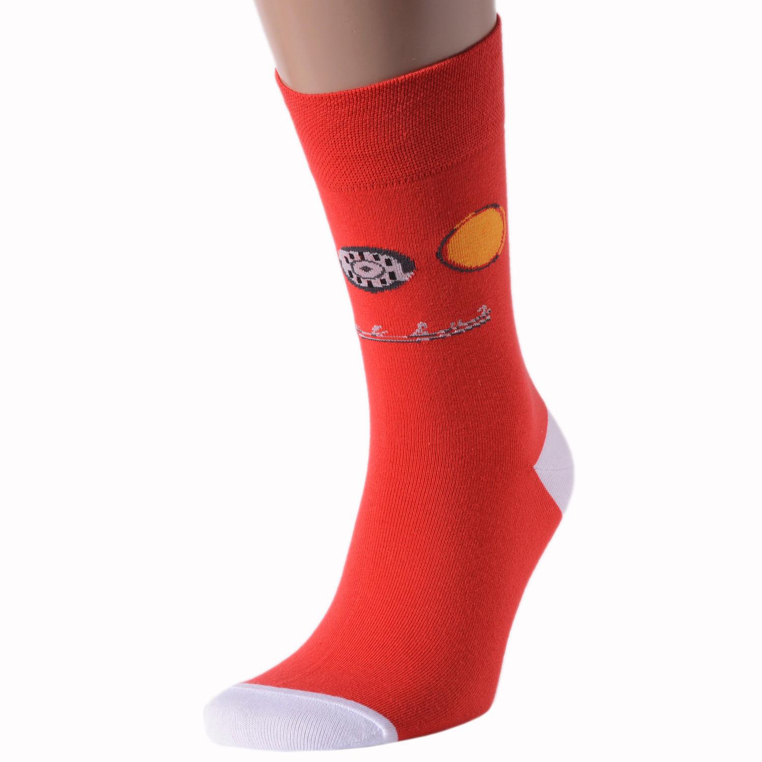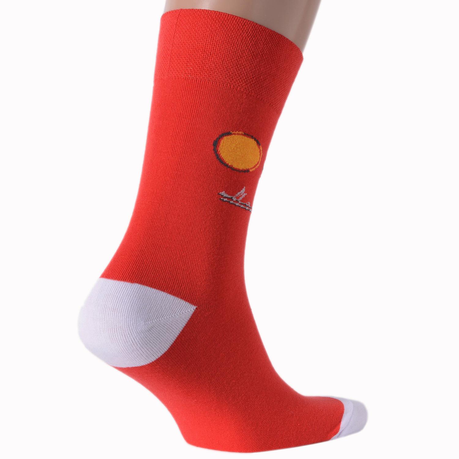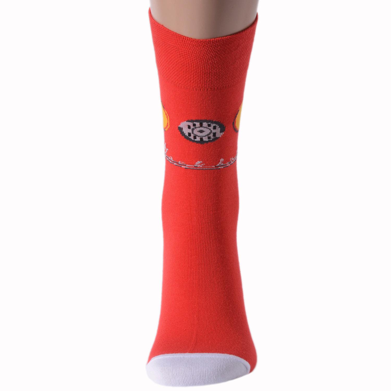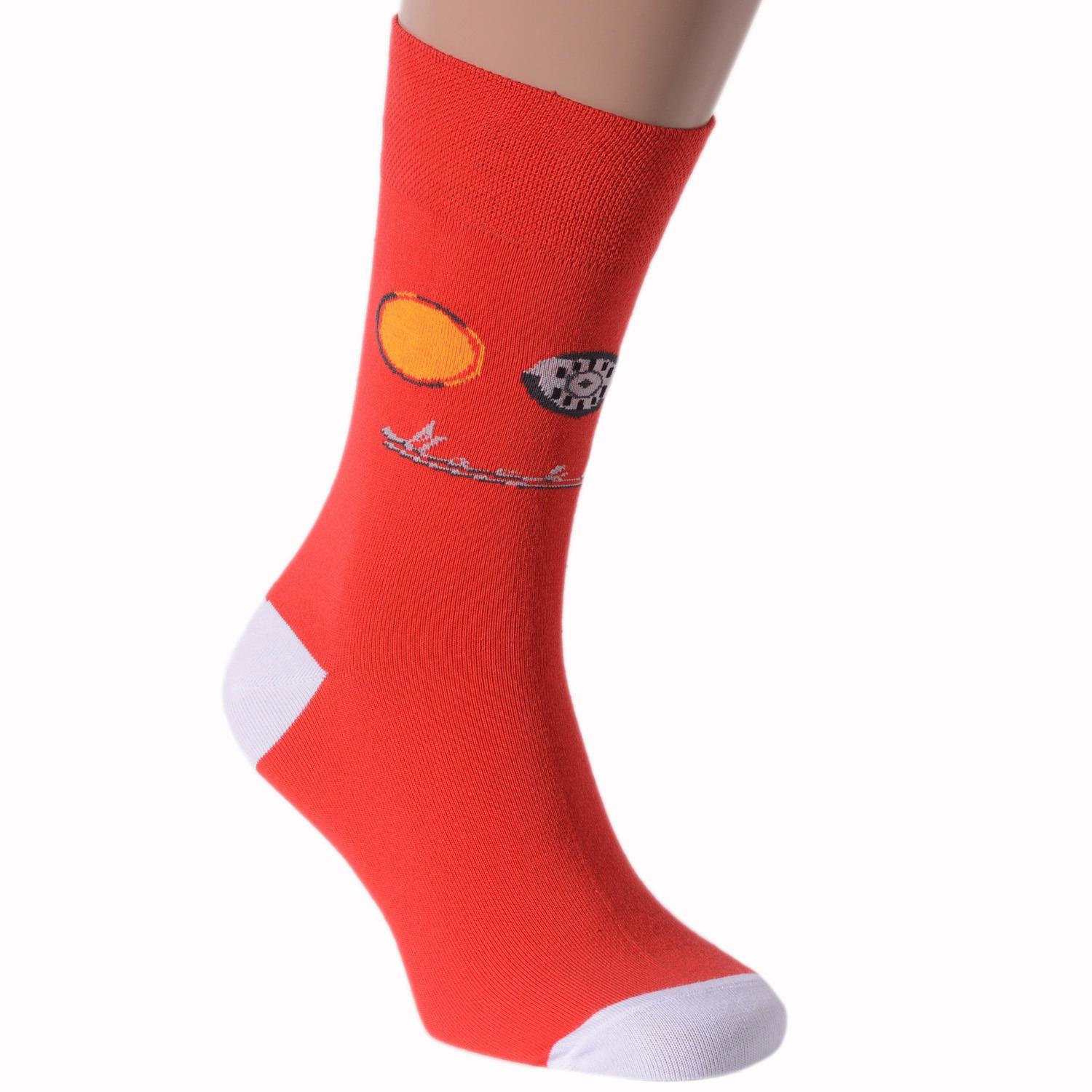 Круглогодичные средней длины мужские носки, цвет красный, повседневные, шов обычный (не бесшовные), принт (рисунок): крупные контрастные рисунки, с узором, ностальгия, транспорт, состав: 82% хлопок, 15% полиамид, 3% эластан, арт. NM-145. Производитель «ИП Рыбалкин В.С., Московская область, г. Щелково» под брендом «Msclub».