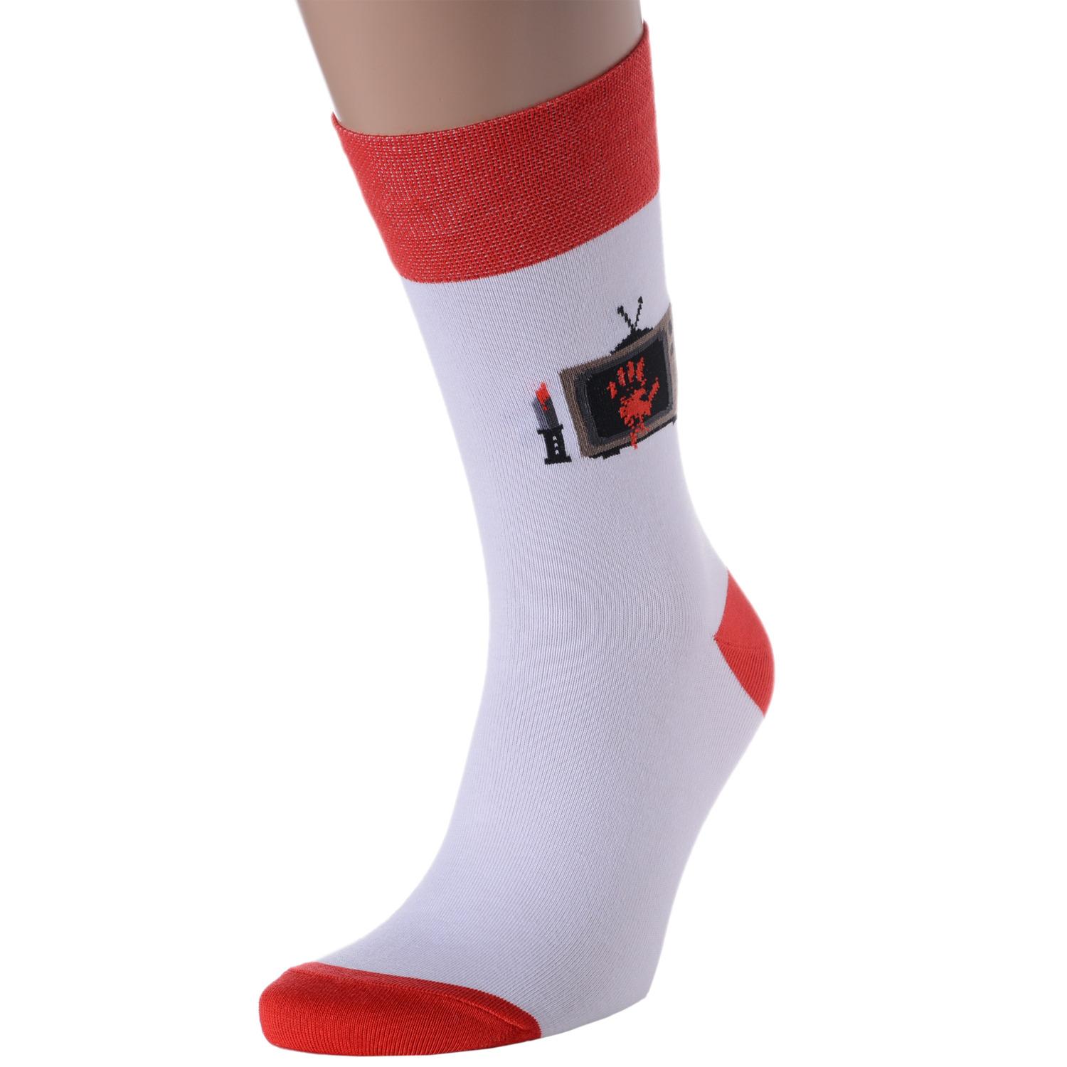 Круглогодичные средней длины мужские носки, цвет многоцветные (мультиколор)-белый, повседневные, шов обычный (не бесшовные), принт (рисунок): хоррор / ужасы, люди, крупные контрастные рисунки, с узором, состав: 82% хлопок, 15% полиамид, 3% эластан, арт. Nm-211. Производитель «ИП Рыбалкин В.С., Московская область, г. Щелково» под брендом «Msclub».