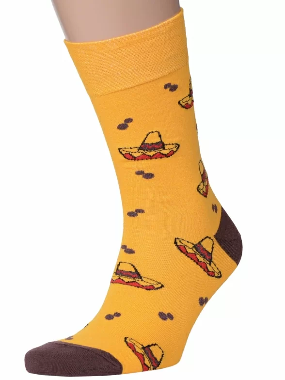 Круглогодичные средней длины мужские носки, цвет желтый, повседневные, шов обычный (не бесшовные), принт (рисунок): путешествия, овощи / фрукты / ягоды, крупные контрастные рисунки, с узором, состав: 82% хлопок, 15% полиамид, 3% эластан, арт. Nm-276. Производитель «ИП Рыбалкин В.С., Московская область, г. Щелково» под брендом «Msclub».