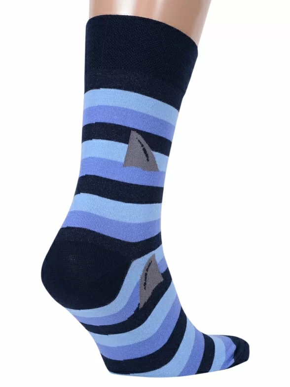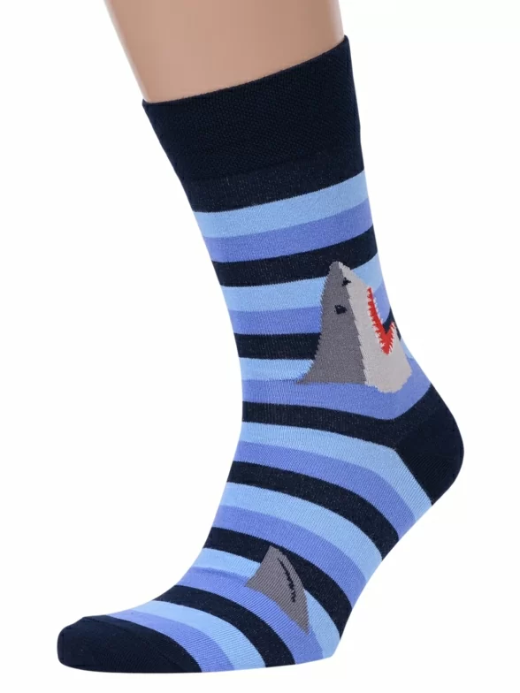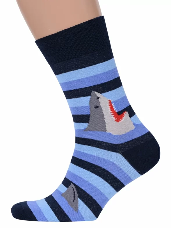 Круглогодичные средней длины мужские носки, цвет синий-многоцветные (мультиколор), повседневные, шов обычный (не бесшовные), принт (рисунок): крупные контрастные рисунки, с узором, животные, море, состав: 82% хлопок, 15% полиамид, 3% эластан, арт. Nm-318. Производитель «ИП Рыбалкин В.С., Московская область, г. Щелково» под брендом «Msclub».