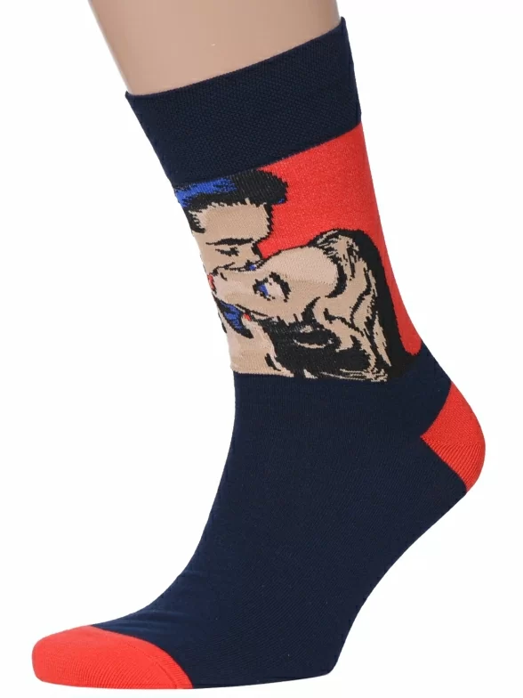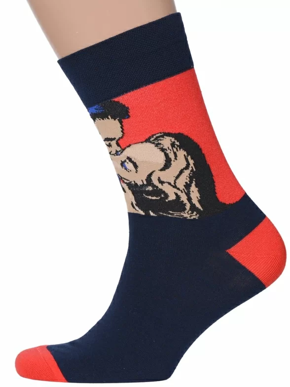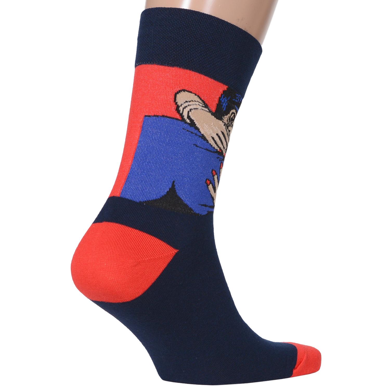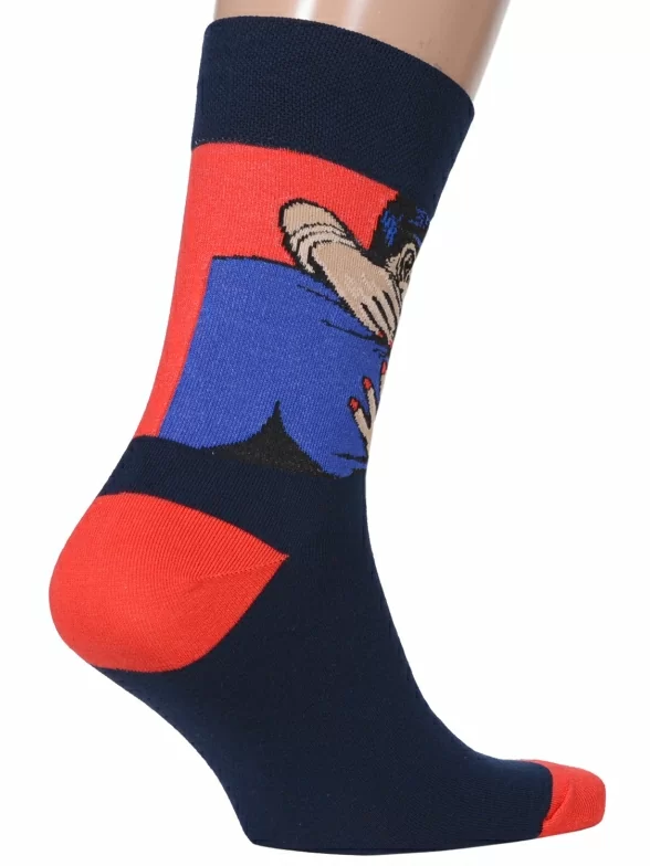 Круглогодичные средней длины мужские носки, цвет темно-синий, повседневные, шов обычный (не бесшовные), принт (рисунок): фильмы / сериалы / мультики, люди, крупные контрастные рисунки, с узором, состав: 82% хлопок, 15% полиамид, 3% эластан, арт. Nm-343. Производитель «ИП Рыбалкин В.С., Московская область, г. Щелково» под брендом «Msclub».