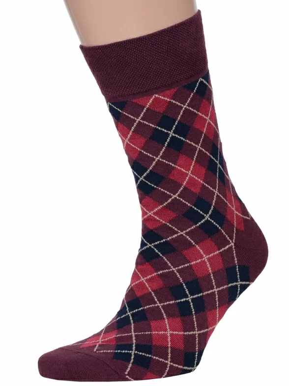 Круглогодичные средней длины мужские носки, цвет бордовый-многоцветные (мультиколор), классические, шов обычный (не бесшовные), принт (рисунок): с узором, аргайл, клетка, состав: 82% хлопок, 15% полиамид, 3% эластан, арт. Nm-357. Производитель «ИП Рыбалкин В.С., Московская область, г. Щелково» под брендом «Msclub».
