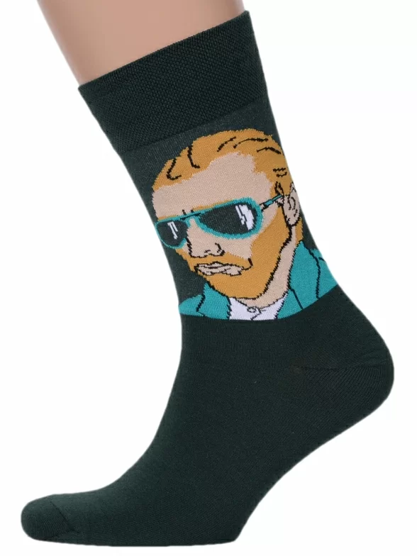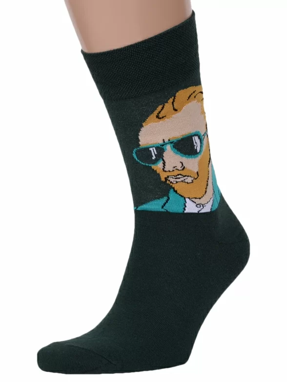 Круглогодичные средней длины мужские носки, цвет хаки-многоцветные (мультиколор), повседневные, шов обычный (не бесшовные), принт (рисунок): крупные контрастные рисунки, с узором, знаменитости, люди, поп-культура, произведения искусства / цитаты, состав: 82% хлопок, 15% полиамид, 3% эластан, арт. Nm-388. Производитель «ИП Рыбалкин В.С., Московская область, г. Щелково» под брендом «Msclub».