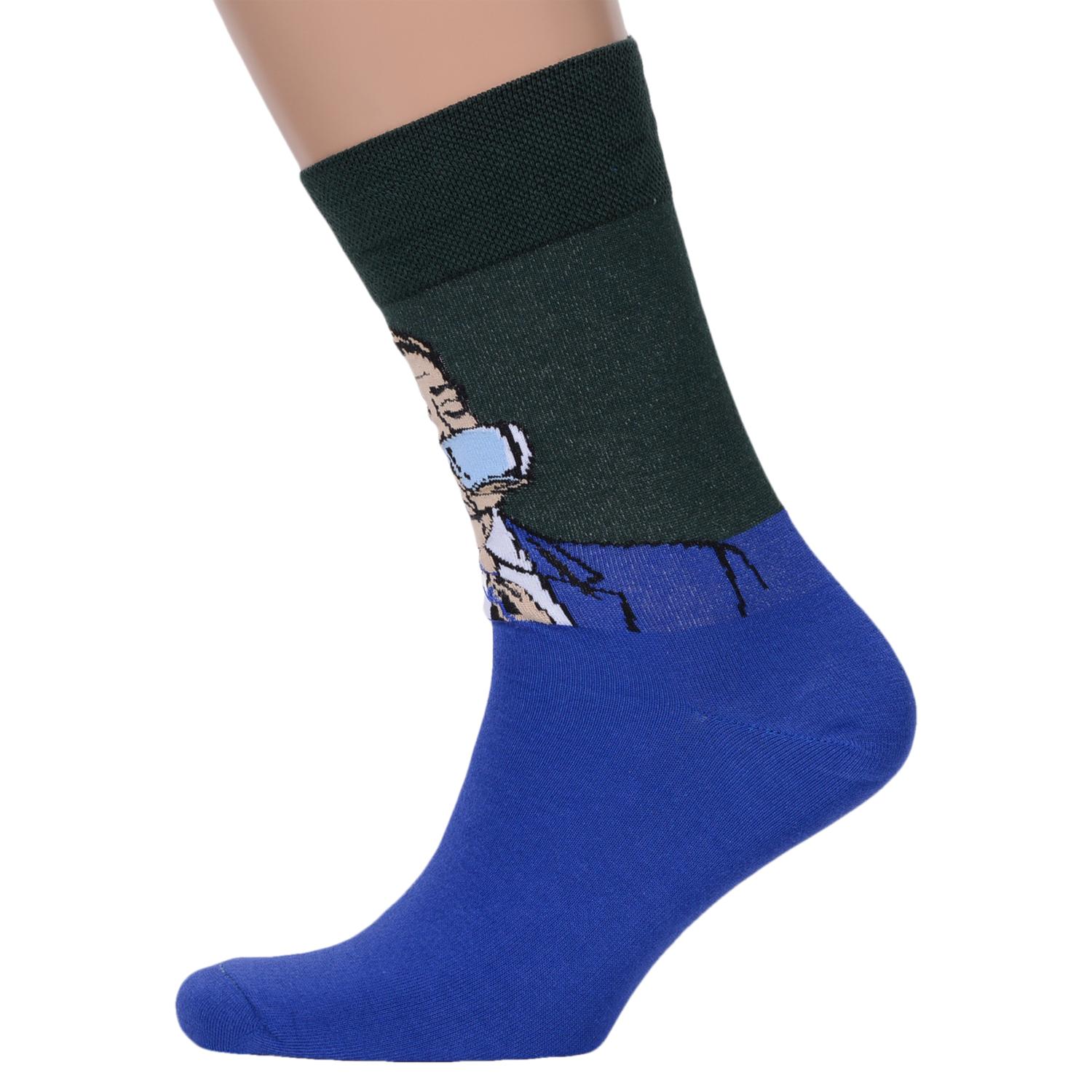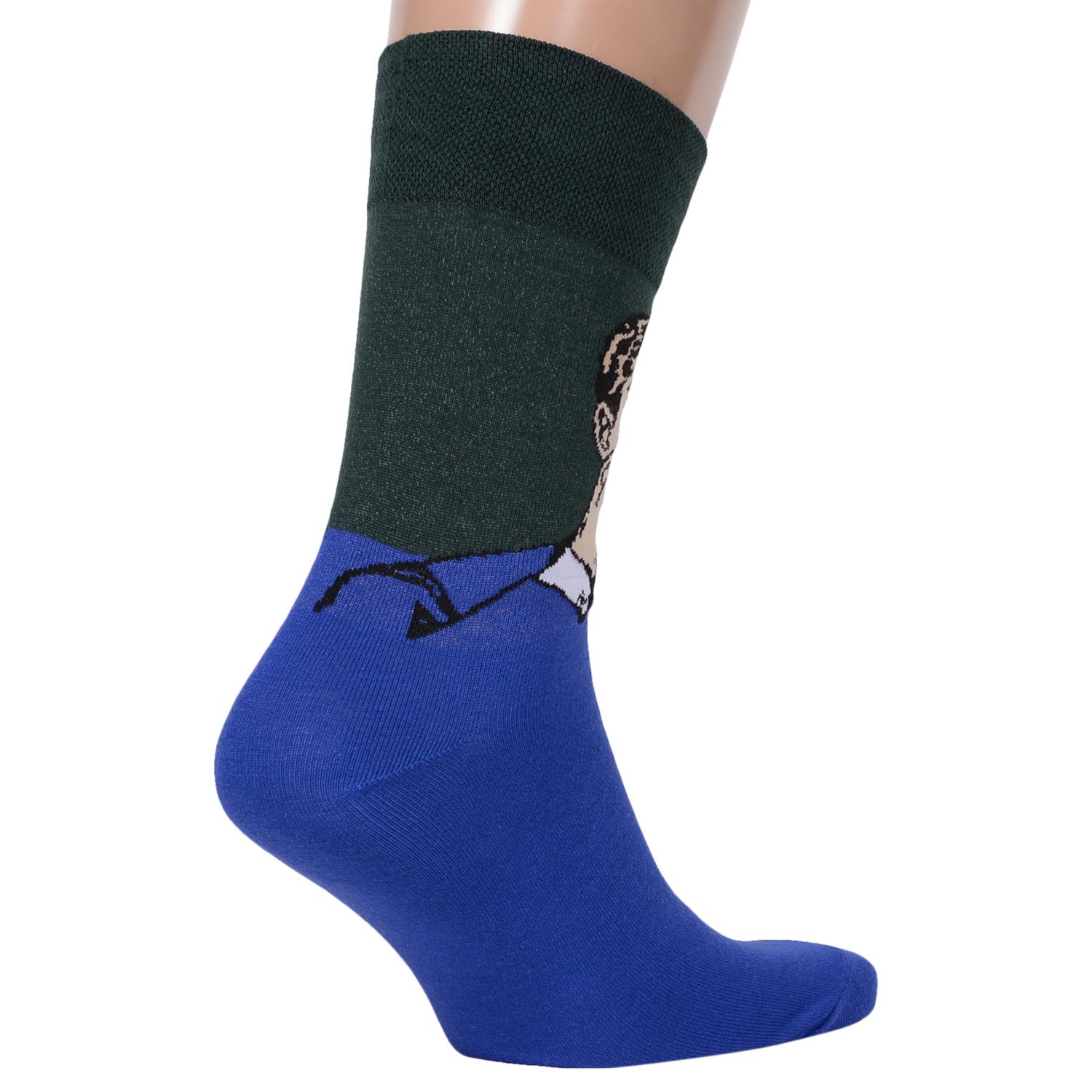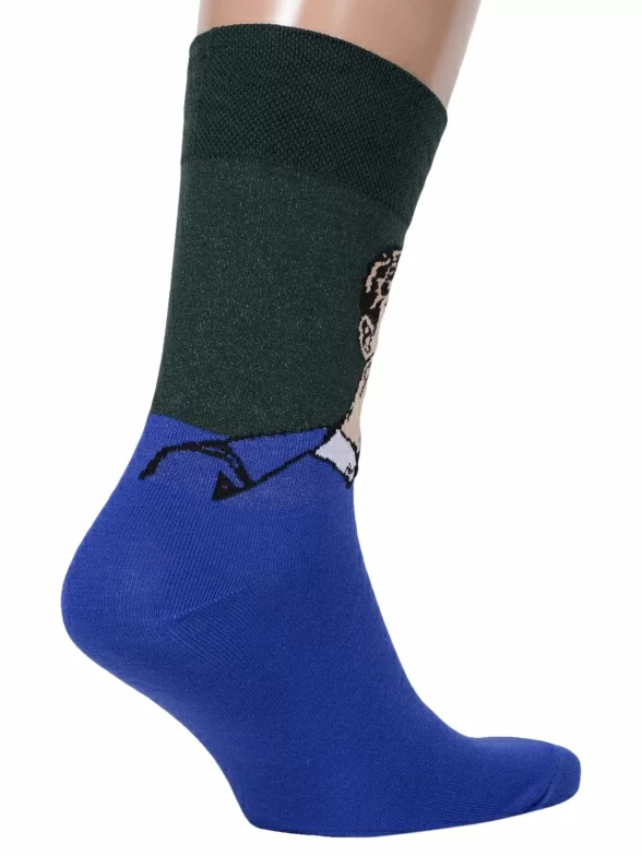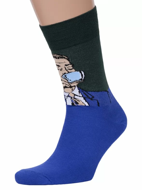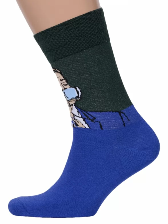 Круглогодичные средней длины мужские носки, цвет синий-многоцветные (мультиколор), повседневные, шов обычный (не бесшовные), принт (рисунок): крупные контрастные рисунки, с узором, люди, фильмы / сериалы / мультики, состав: 82% хлопок, 15% полиамид, 3% эластан, арт. Nm-398. Производитель «ИП Рыбалкин В.С., Московская область, г. Щелково» под брендом «Msclub».