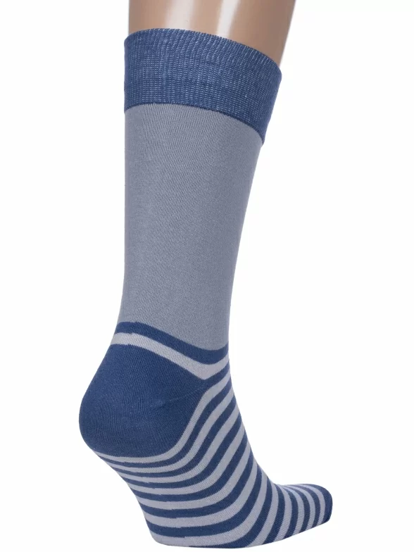 Круглогодичные средней длины мужские носки, цвет синий-джинс, классические, шов обычный (не бесшовные), принт (рисунок): полоски, с узором, состав: 82% хлопок, 15% полиамид, 3% эластан, арт. Nm-566. Производитель «ИП Рыбалкин В.С., Московская область, г. Щелково» под брендом «Msclub».