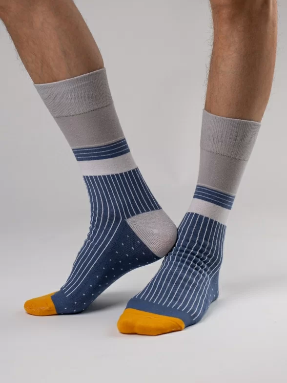 Круглогодичные средней длины мужские носки, цвет синий, повседневные, шов обычный (не бесшовные), принт (рисунок): полоски, контрастные пятка / мысок / резинка, горох / точка, состав: 82% хлопок, 15% полиамид, 3% эластан, арт. Nm-595. Производитель «ИП Рыбалкин В.С., Московская область, г. Щелково» под брендом «Msclub».