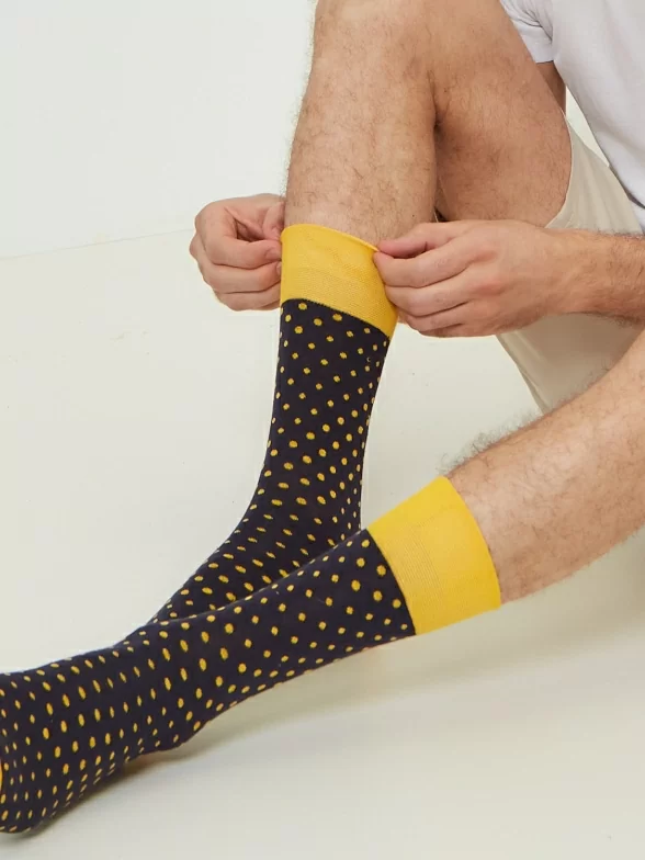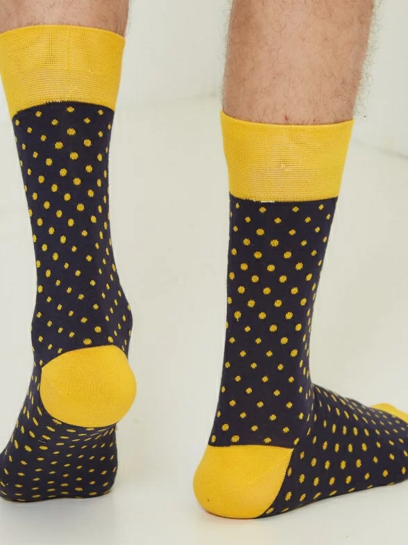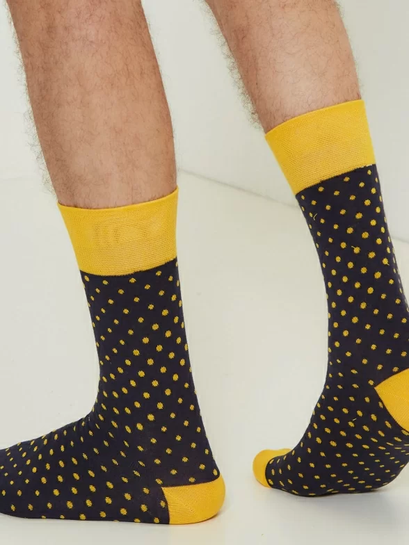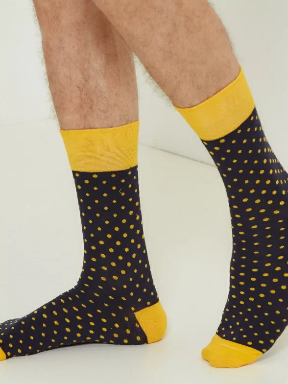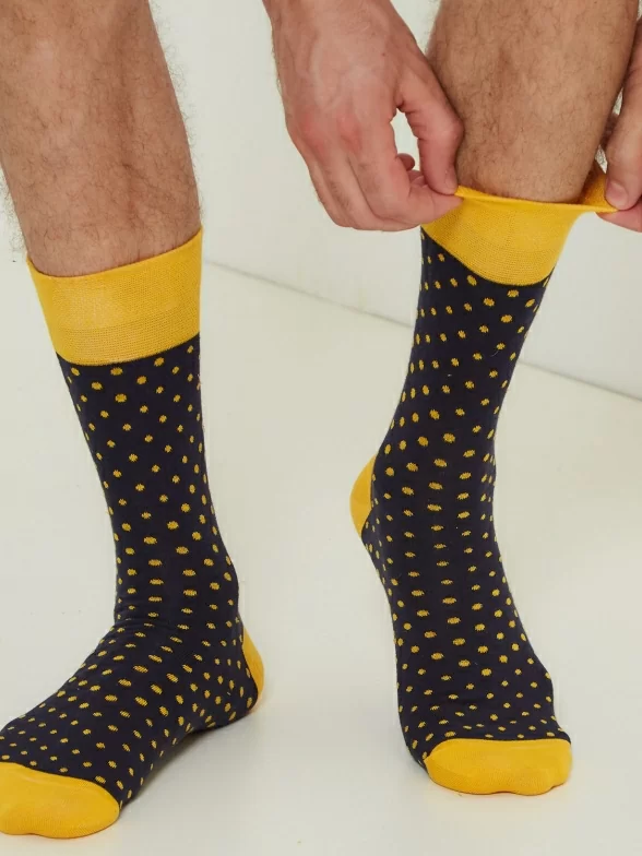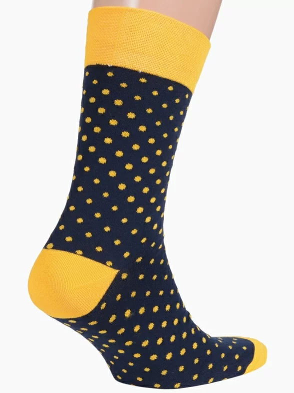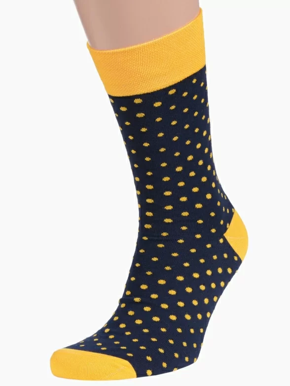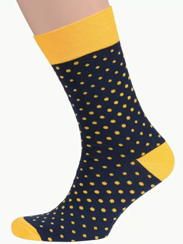 Круглогодичные средней длины мужские носки, цвет темно-синий, повседневные, шов обычный (не бесшовные), принт (рисунок): горох / точка, с узором, состав: 82% хлопок, 15% полиамид, 3% эластан, арт. Nm-27Э. Производитель «ИП Рыбалкин В.С., Московская область, г. Щелково» под брендом «Msclub».