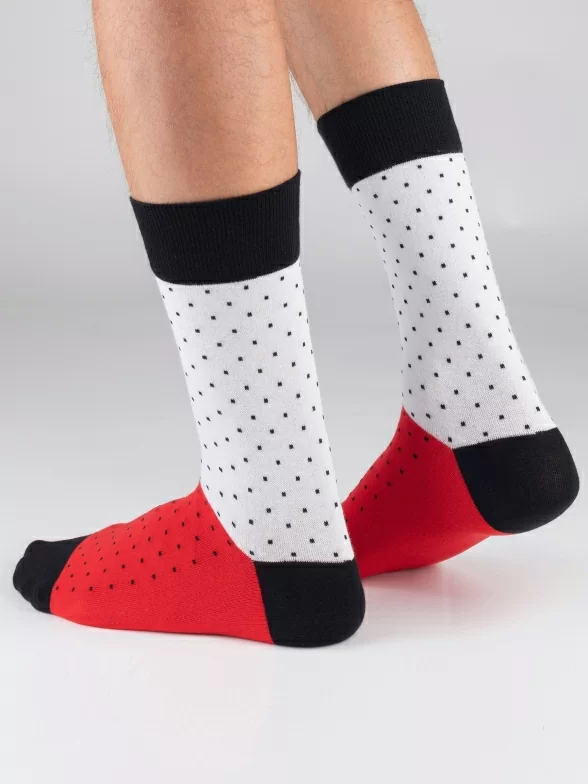 Круглогодичные средней длины мужские носки, цвет многоцветные (мультиколор), повседневные, шов обычный (не бесшовные), принт (рисунок): контрастные пятка / мысок / резинка, горох / точка, состав: 82% хлопок, 15% полиамид, 3% эластан, арт. МА-НМ4-2. Производитель «ООО «Чулочно-носочная фабрика «Нева-Сокс», Ленинградская обл, Россия» под брендом «Нева-сокс».