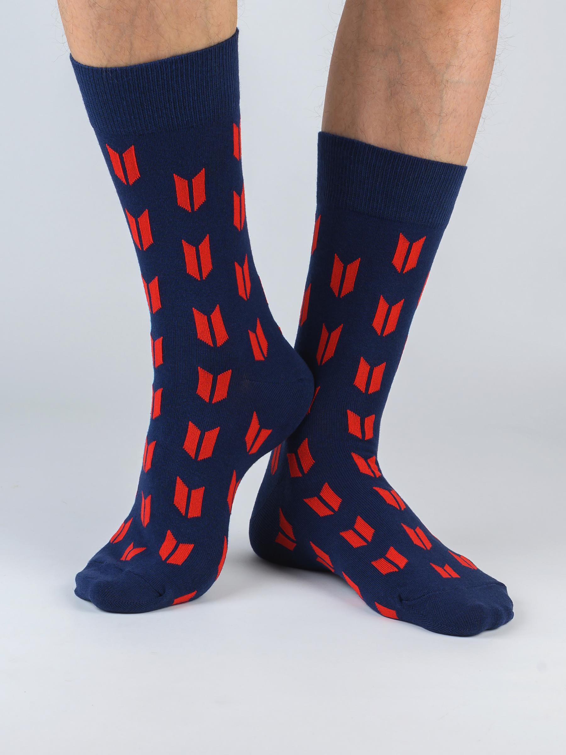 Круглогодичные средней длины мужские носки, цвет темно-синий, повседневные, шов обычный (не бесшовные), принт (рисунок): геометрия, состав: 82% хлопок, 15% полиамид, 3% эластан, арт. МА-НМ29. Производитель «ООО «Чулочно-носочная фабрика «Нева-Сокс», Ленинградская обл, Россия» под брендом «Нева-сокс».