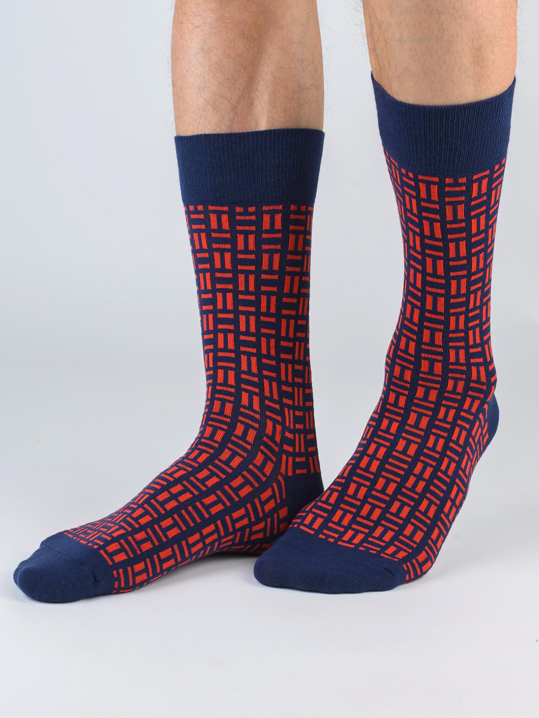 Круглогодичные средней длины мужские носки, цвет темно-синий, повседневные, шов обычный (не бесшовные), принт (рисунок): геометрия, состав: 82% хлопок, 15% полиамид, 3% эластан, арт. MAG-НМ2. Производитель «ООО «Чулочно-носочная фабрика «Нева-Сокс», Ленинградская обл, Россия» под брендом «Нева-сокс».