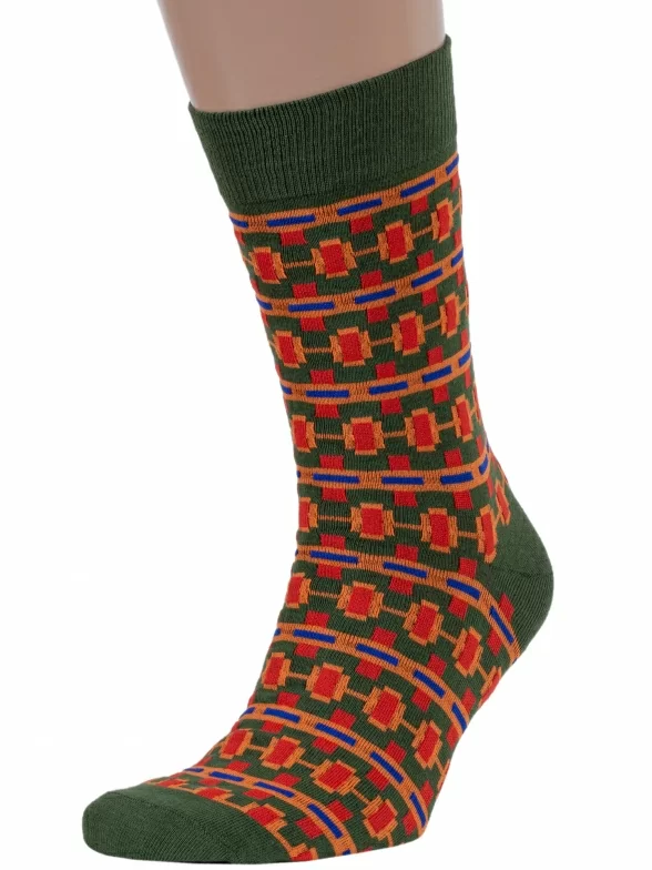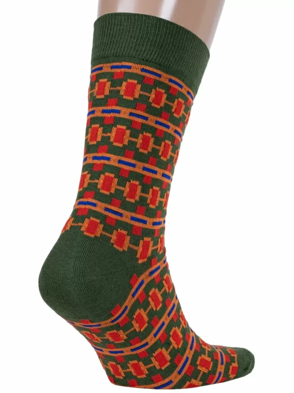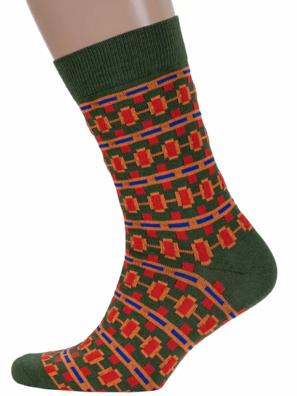 Круглогодичные средней длины мужские носки, цвет оранжевый-многоцветные (мультиколор), повседневные, шов обычный (не бесшовные), принт (рисунок): орнамент, геометрия, с узором, состав: 80% хлопок, 17% полиамид, 3% лайкра (эластан), арт. МАG-24. Производитель «ООО «Чулочно-носочная фабрика «Нева-Сокс», Ленинградская обл, Россия» под брендом «Нева-сокс».