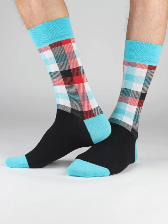 Круглогодичные средней длины мужские носки, цвет многоцветные (мультиколор)-голубой, повседневные, шов обычный (не бесшовные), принт (рисунок): клетка, состав: 82% хлопок, 15% полиамид, 3% эластан, арт. MAG-НМ11. Производитель «ООО «Чулочно-носочная фабрика «Нева-Сокс», Ленинградская обл, Россия» под брендом «Нева-сокс».