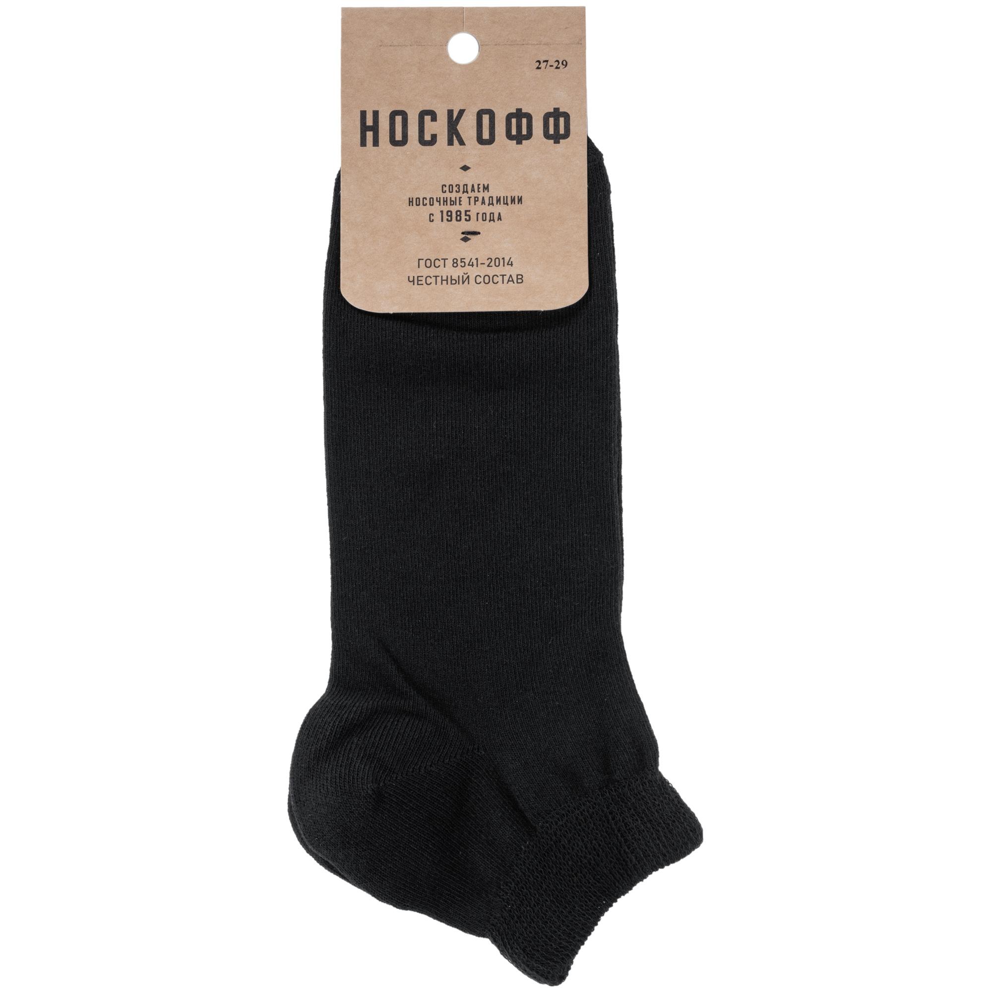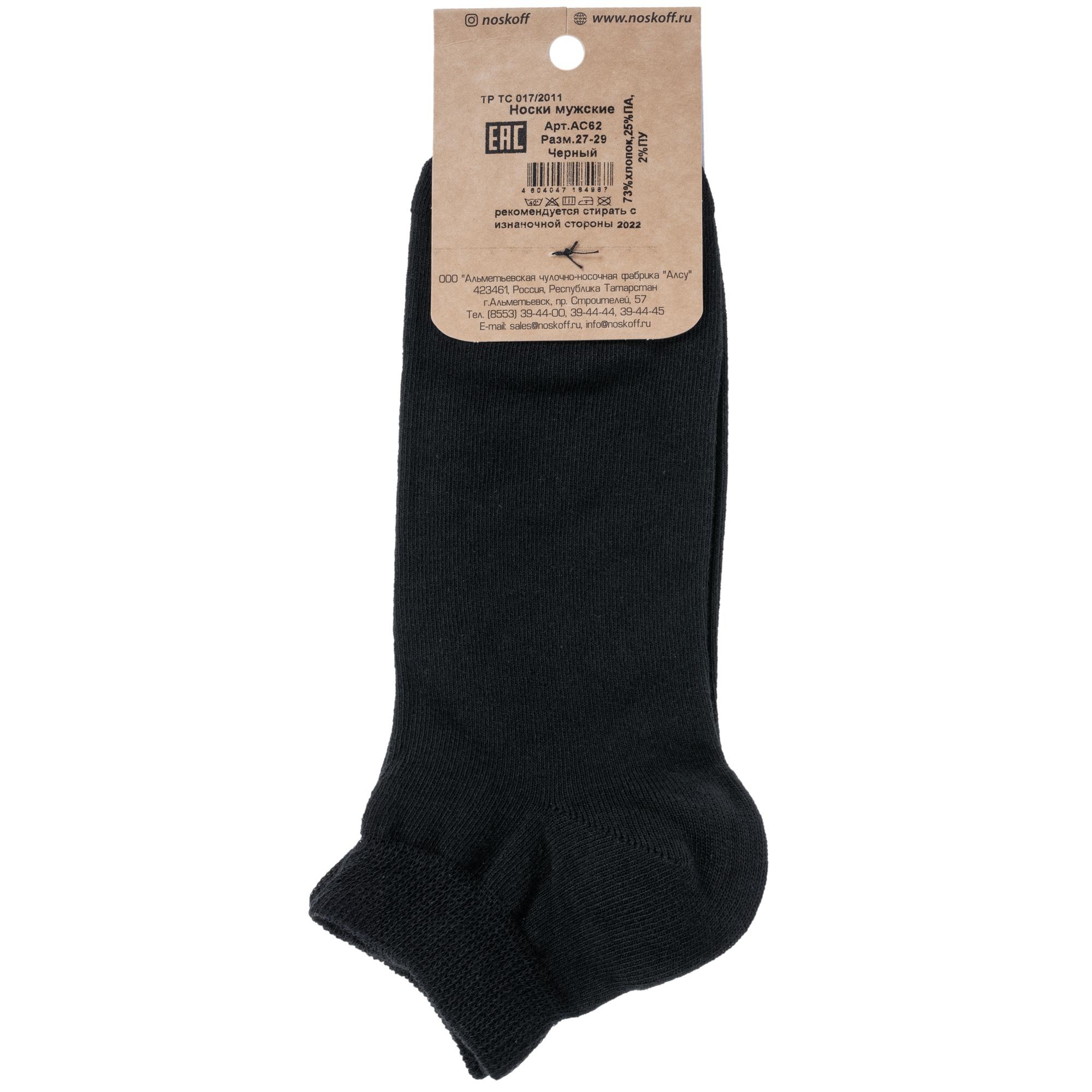 Круглогодичные или летние короткие мужские носки, цвет черный, классические, шов обычный (не бесшовные), принт (рисунок): однотонный, без рисунков/узоров, состав: 73% хлопок, 25% полиамид, 2% полиуретан (эластан), арт. АС62. Производитель «Носкофф» Россия под брендом «Носкофф (алсу)».