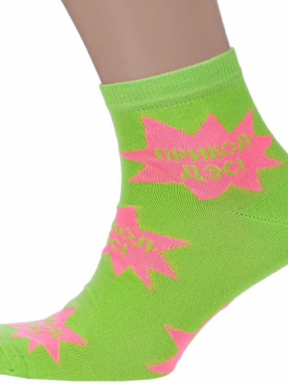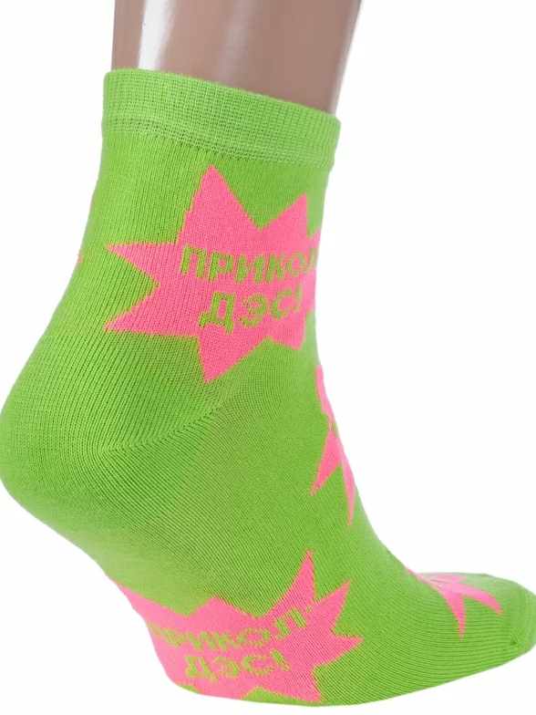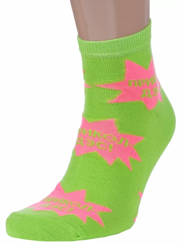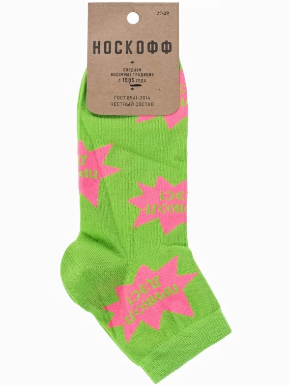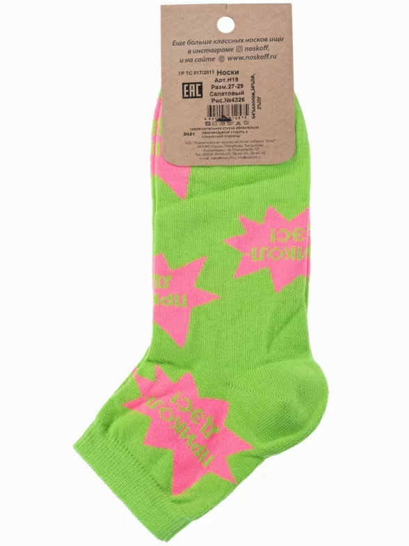 Круглогодичные укороченные носки унисекс, цвет салатовый-многоцветные (мультиколор), повседневные, шов обычный (не бесшовные), принт (рисунок): надписи, с узором, состав: 64% хлопок, 34% полиамид, 2% полиуретан (эластан), арт. Н19. Производитель «Носкофф» Россия под брендом «Носкофф (алсу)».