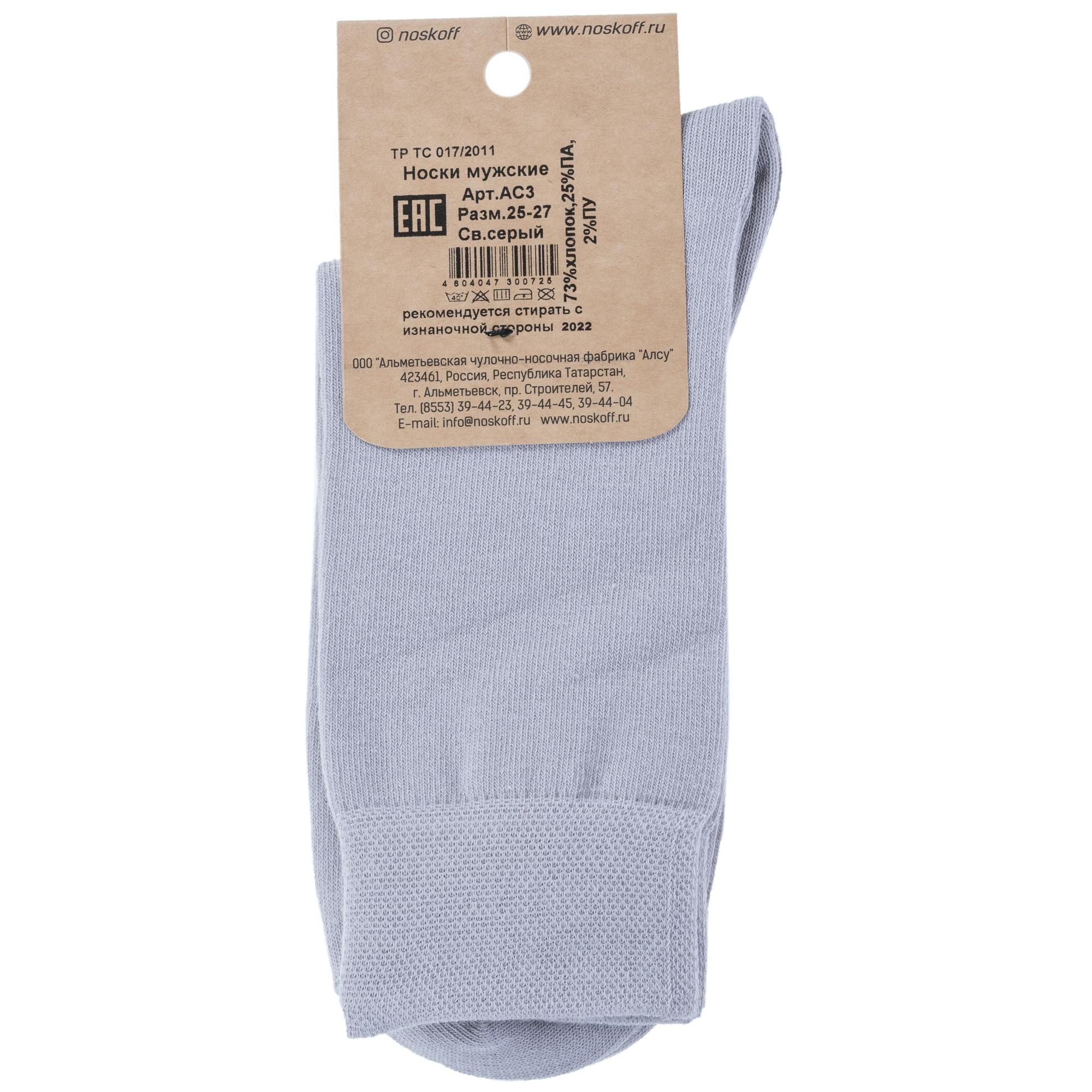 Круглогодичные средней длины мужские носки, цвет светло-серый, классические, шов обычный (не бесшовные), принт (рисунок): однотонный, без рисунков/узоров, состав: 73% хлопок, 25% полиамид, 2% полиуретан (эластан), арт. АС3. Производитель «Носкофф» Россия под брендом «Носкофф (алсу)».