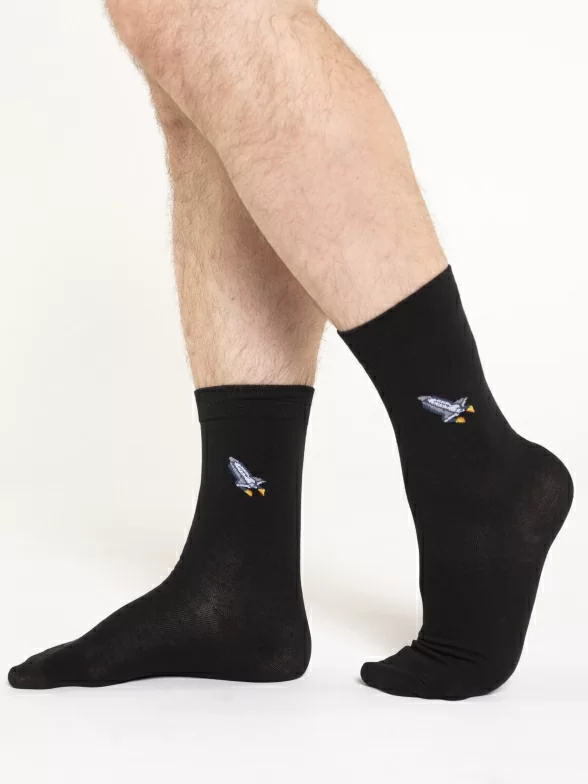 Круглогодичные средней длины мужские носки, цвет черный, классические, шов обычный (не бесшовные), принт (рисунок): космос, ракета, состав: 97% хлопок, 2% полиамид, 1% лайкра, арт. PM479. Производитель «Oemen» Китай под брендом «Oemen».
