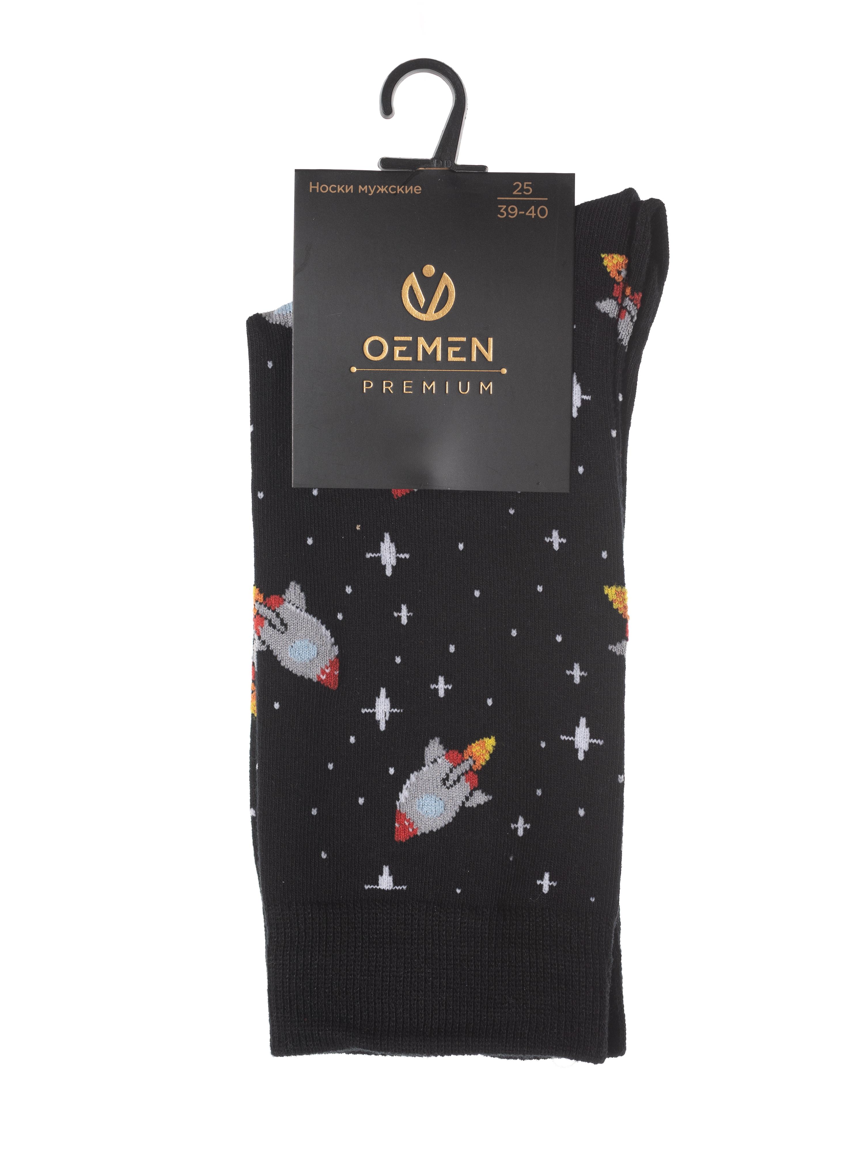 Круглогодичные средней длины мужские носки, цвет черный, классические, шов обычный (не бесшовные), принт (рисунок): космос, ракета, состав: 97% хлопок, 2% полиамид, 1% лайкра, арт. PM156. Производитель «Oemen» Китай под брендом «Oemen».