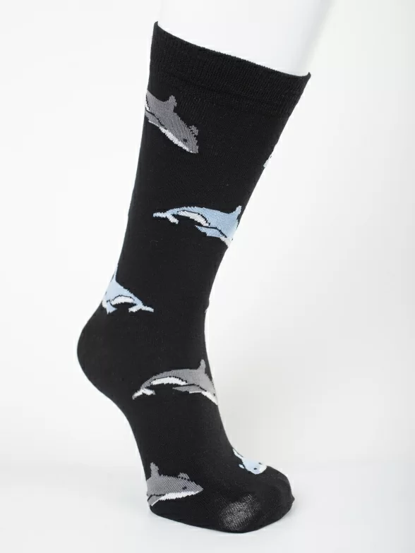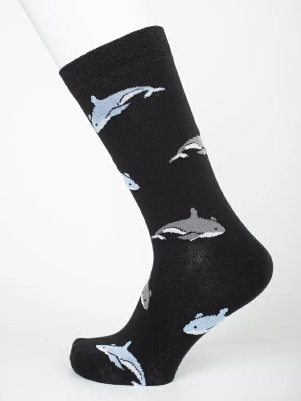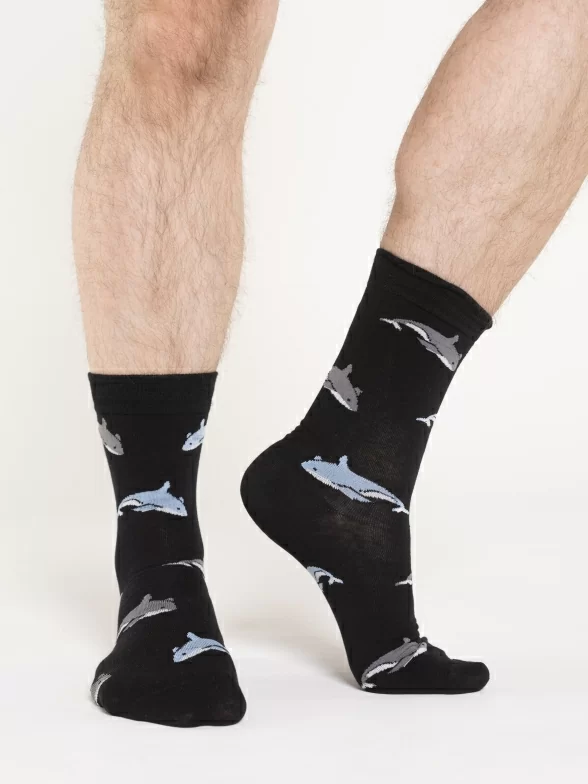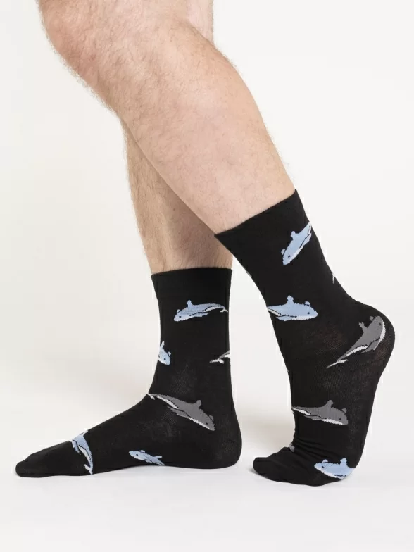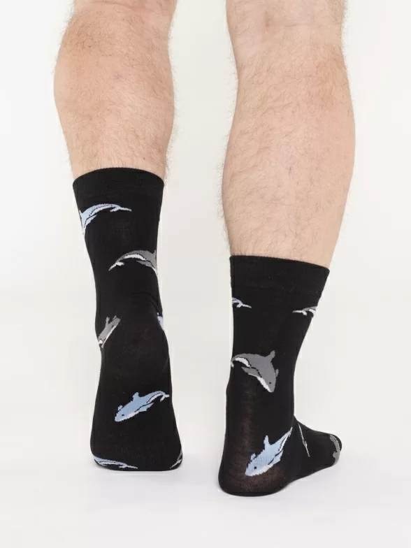 Круглогодичные средней длины мужские носки, цвет черный, классические, шов обычный (не бесшовные), принт (рисунок): рыба, акула, состав: 80% хлопок, 17% нейлон, 3% лайкра, арт. PM249. Производитель «Oemen» Китай под брендом «Oemen».