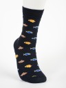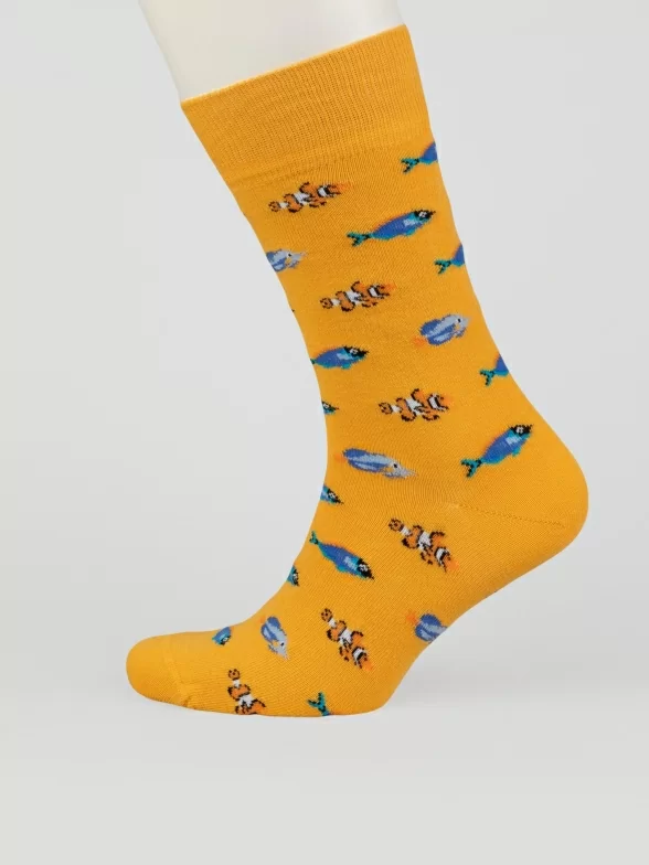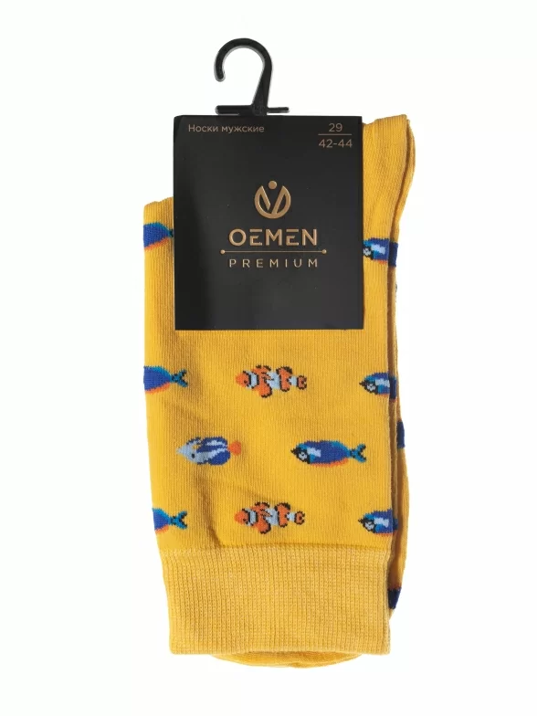 Круглогодичные средней длины мужские носки, цвет желтый, классические, шов обычный (не бесшовные), принт (рисунок): рыбы, состав: 80% хлопок, 17% нейлон, 3% лайкра, арт. PM507. Производитель «Oemen» Китай под брендом «Oemen».