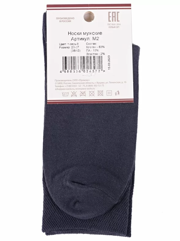 Круглогодичные средней длины мужские носки, цвет темно-серый, классические, шов обычный (не бесшовные), принт (рисунок): однотонный, без рисунков/узоров, состав: 83% хлопок, 15% полиамид, 2% эластан, арт. M2. Производитель «ПРОМЭКС ООО, Смоленская область, Россия» под брендом «Para socks».