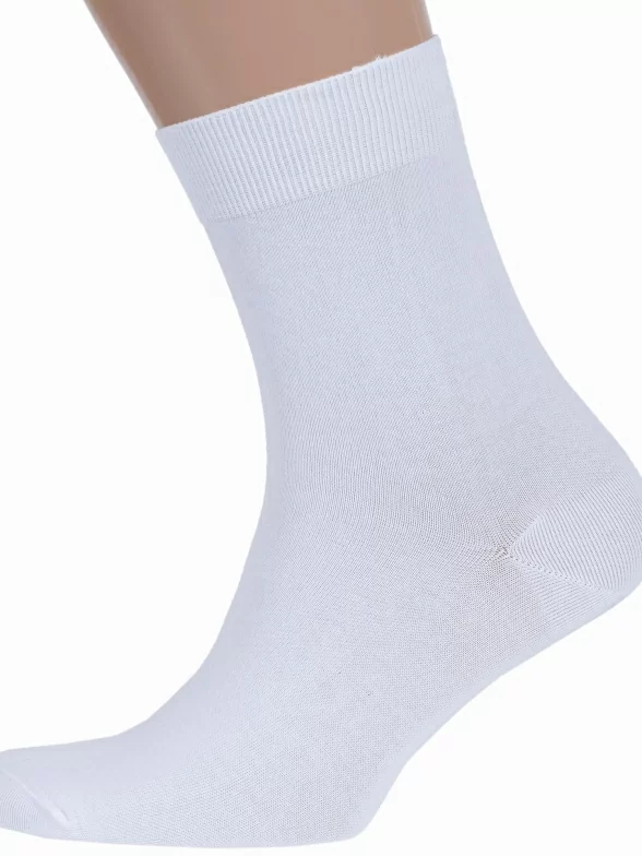 Круглогодичные средней длины мужские носки, цвет белый, классические, шов кеттельный (бесшовная технология), принт (рисунок): однотонный, без рисунков/узоров, состав: 78% хлопок, 20% полиамид, 2% эластан, арт. М-1134. Производитель «ООО Орудьевский трикотаж, Россия» под брендом «Rusocks (орудьевский трикотаж)».