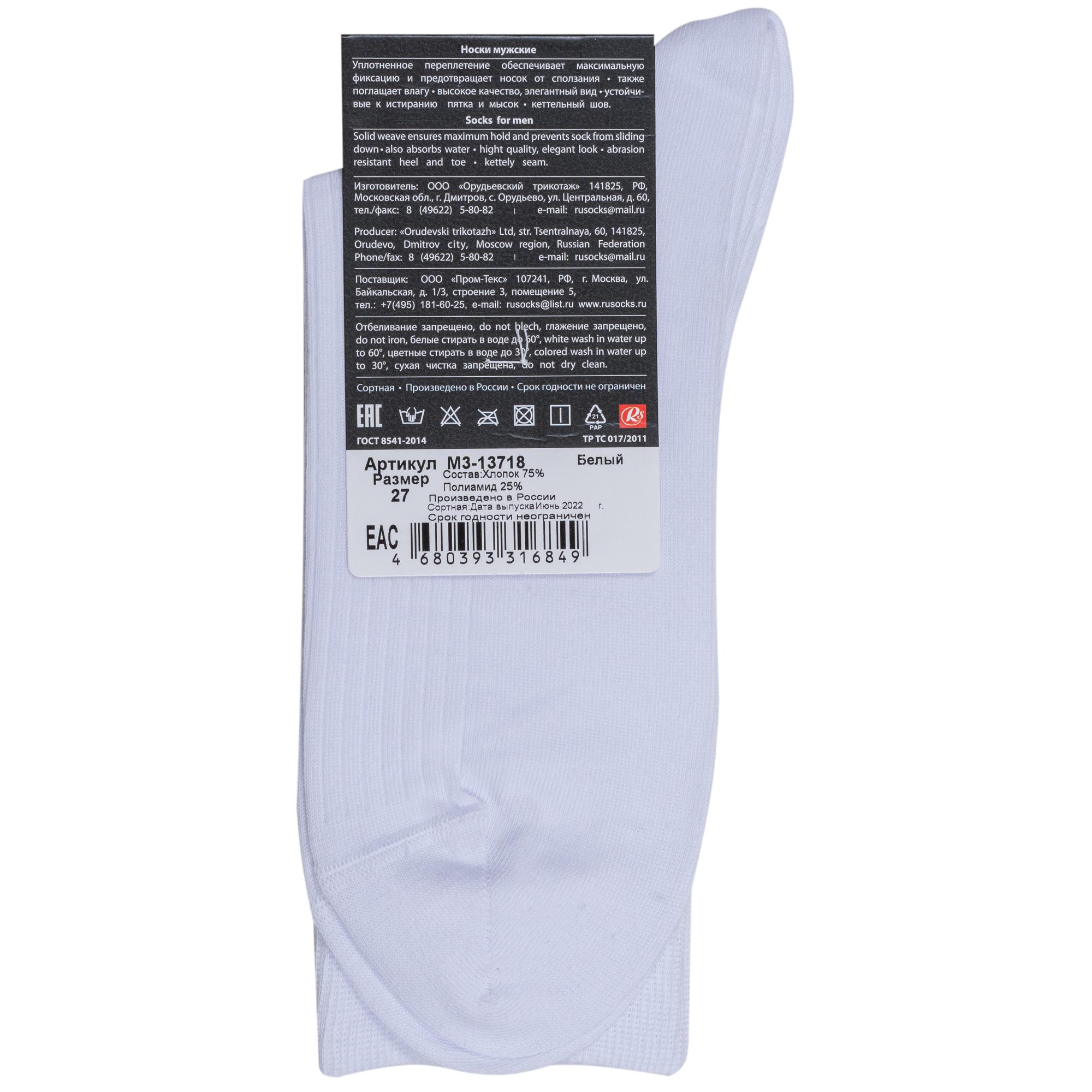 Круглогодичные средней длины мужские носки, цвет белый, классические, шов кеттельный (бесшовная технология), принт (рисунок): в рубчик, однотонный, состав: 75% хлопок, 25% полиамид, арт. М3-13718. Производитель «ООО Орудьевский трикотаж, Россия» под брендом «Rusocks (орудьевский трикотаж)».