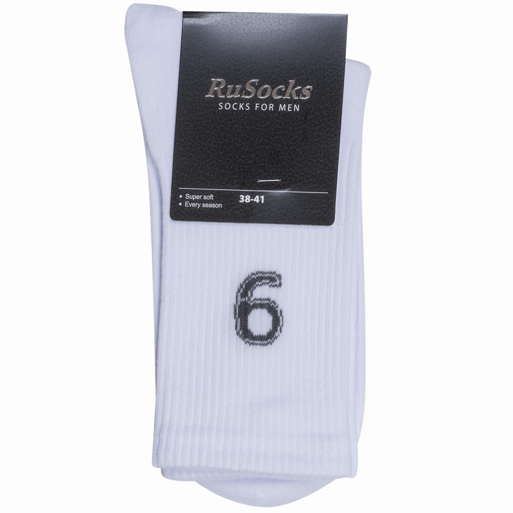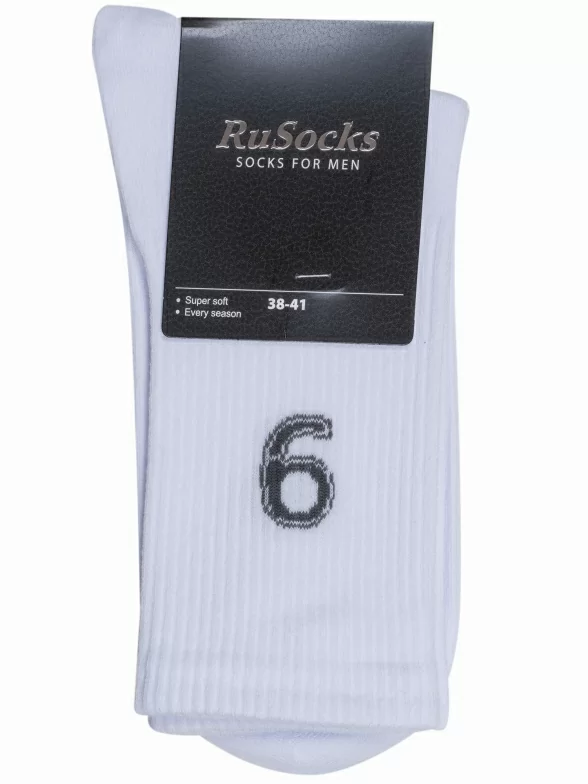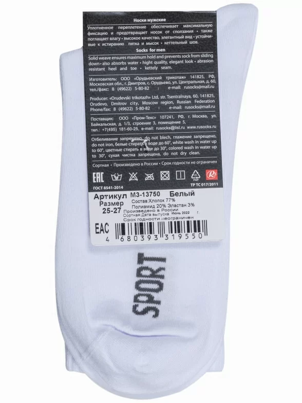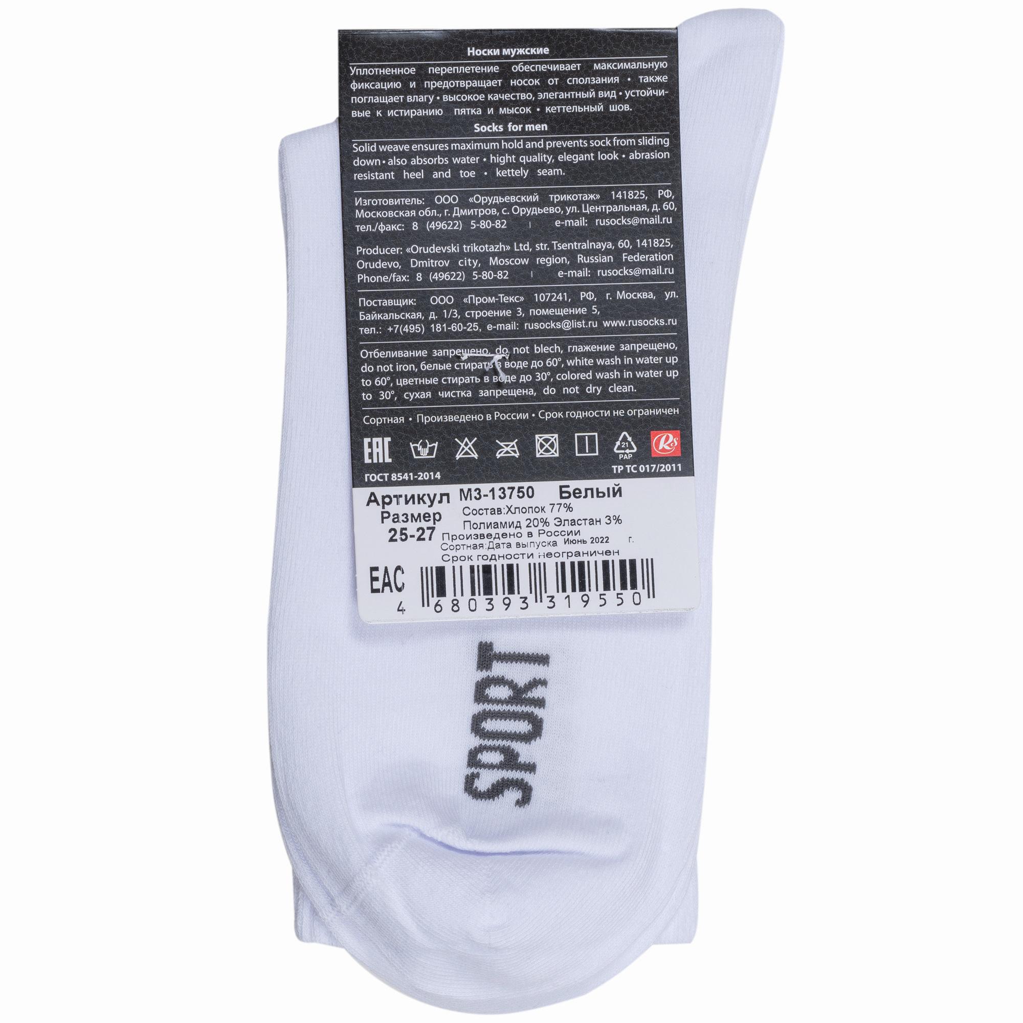 Круглогодичные средней длины мужские носки, цвет белый, спортивные, шов кеттельный (бесшовная технология), принт (рисунок): спортивные, в рубчик, однотонный, небольшой рисунок, состав: 77% хлопок, 20% полиамид, 3% эластан, арт. М3-13750. Производитель «ООО Орудьевский трикотаж, Россия» под брендом «Rusocks (орудьевский трикотаж)».
