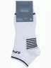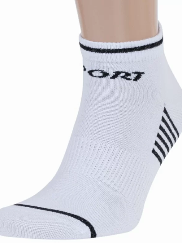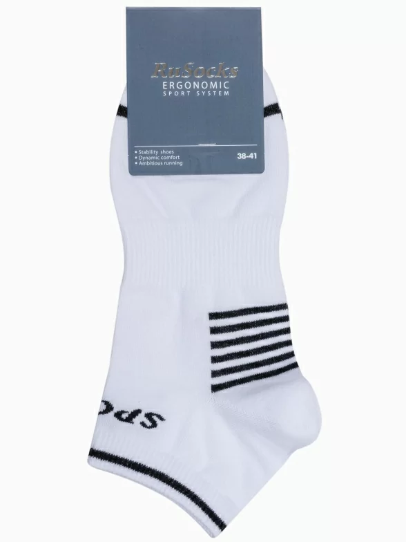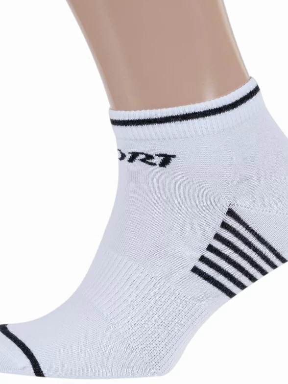 Круглогодичные короткие мужские носки, цвет белый, спортивные, шов кеттельный (бесшовная технология), принт (рисунок): спортивные, с узором, состав: 77% хлопок, 20% полиамид, 3% эластан, арт. М3-23743. Производитель «ООО Орудьевский трикотаж, Россия» под брендом «Rusocks (орудьевский трикотаж)».