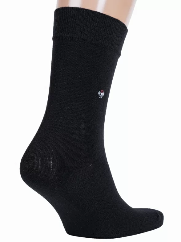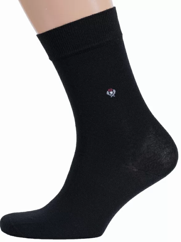 Круглогодичные средней длины мужские носки, цвет черный, классические, шов кеттельный (бесшовная технология), принт (рисунок): однотонный, небольшой рисунок, состав: 83% хлопок, 15% полиамид, 2% эластан, арт. М-197. Производитель «ООО Орудьевский трикотаж, Россия» под брендом «Rusocks (орудьевский трикотаж)».