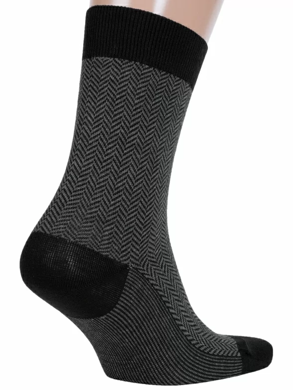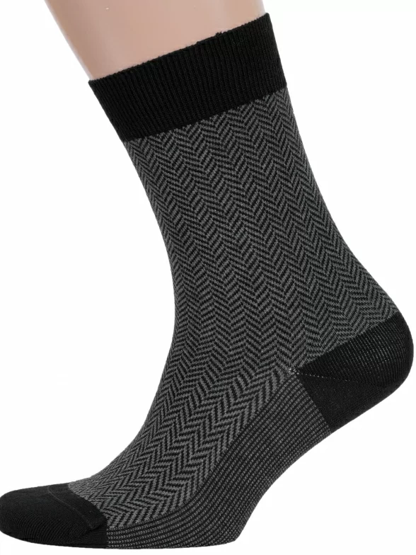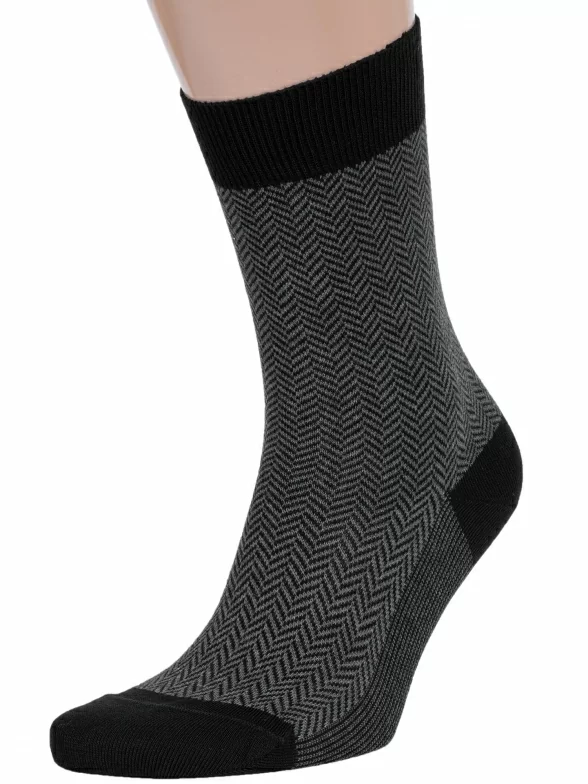 Круглогодичные средней длины мужские носки, цвет черный, классические, шов кеттельный (бесшовная технология), принт (рисунок): елочка / гусиная лапка, с узором, состав: 75% хлопок, 25% полиамид, арт. М3-12021. Производитель «ООО Орудьевский трикотаж, Россия» под брендом «Rusocks (орудьевский трикотаж)».