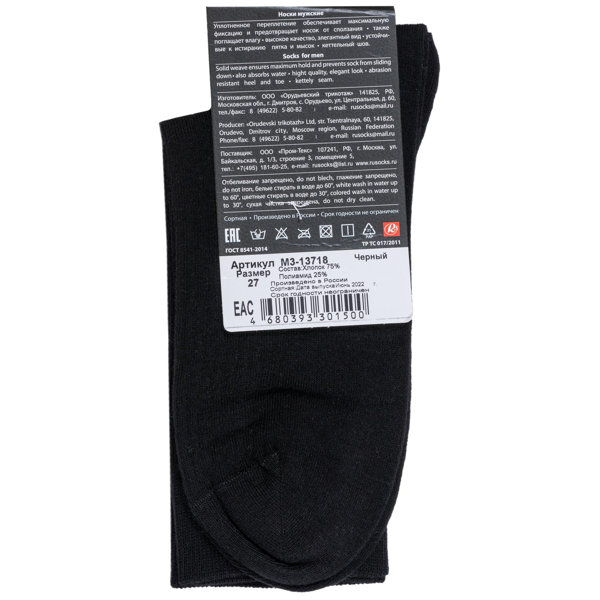 Круглогодичные средней длины мужские носки, цвет черный, классические, шов кеттельный (бесшовная технология), принт (рисунок): в рубчик, однотонный, состав: 75% хлопок, 25% полиамид, арт. М3-13718. Производитель «ООО Орудьевский трикотаж, Россия» под брендом «Rusocks (орудьевский трикотаж)».