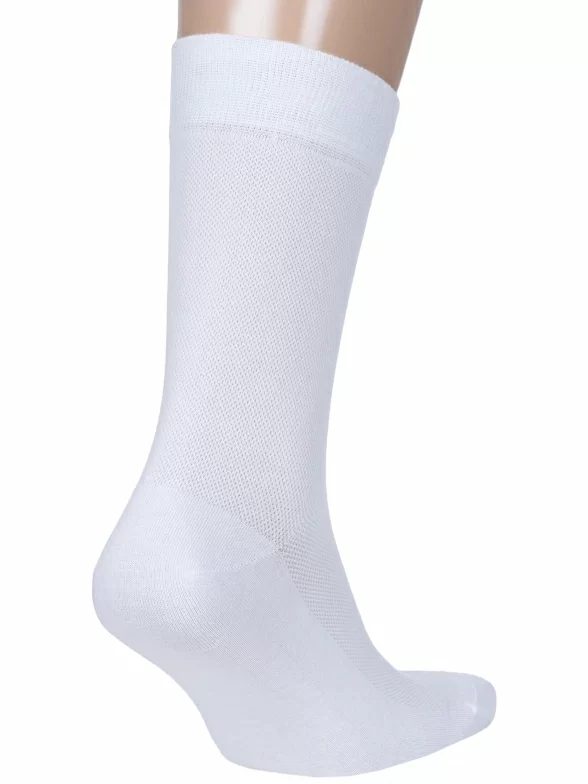Летние средней длины мужские носки, цвет белый, в сеточку, спортивные, классические, шов кеттельный (бесшовная технология), принт (рисунок): однотонный, без рисунков/узоров, состав: 78% хлопок, 20% полиамид, 2% эластан, арт. М3-13751. Производитель «ООО Орудьевский трикотаж, Россия» под брендом «Rusocks (орудьевский трикотаж)».