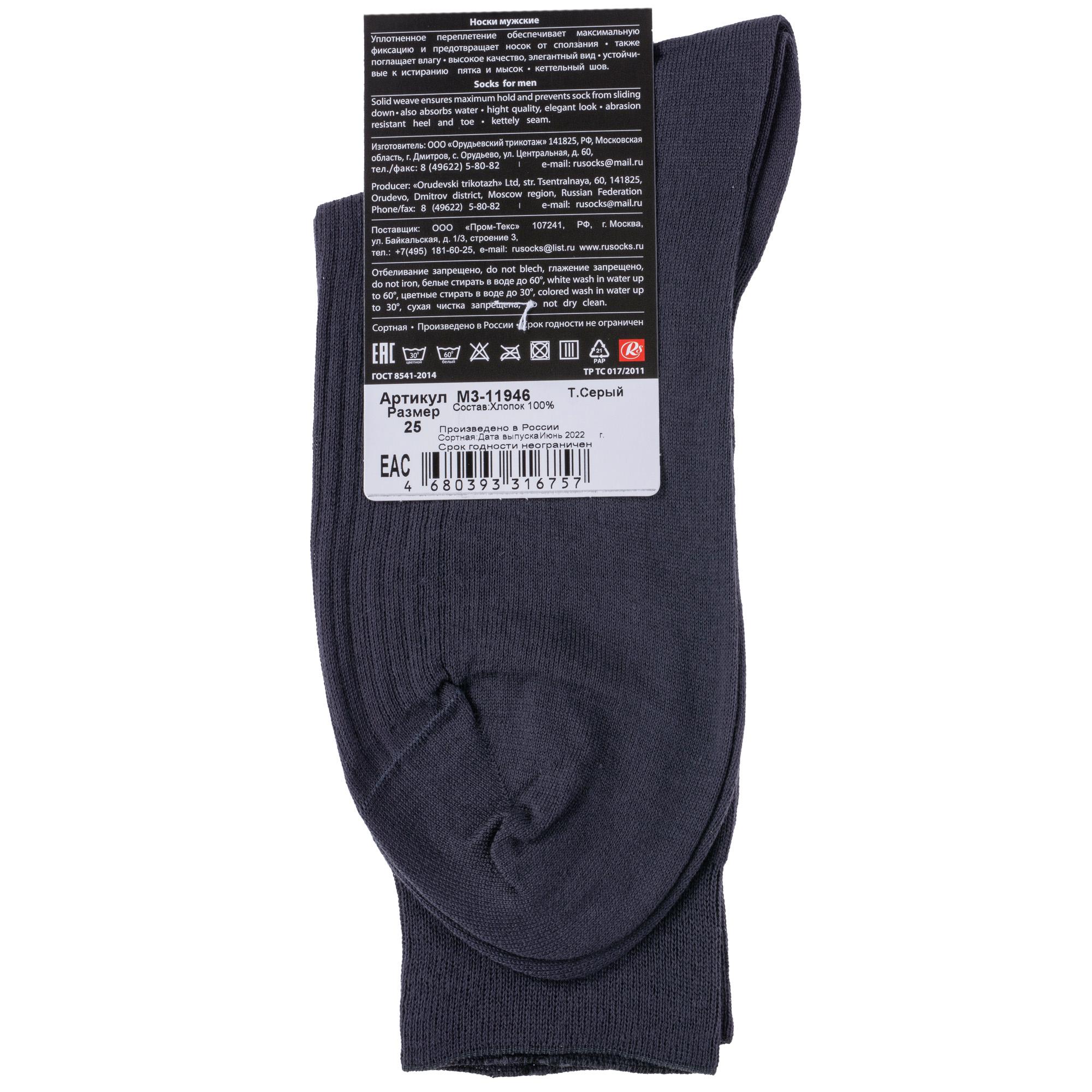 Летние или круглогодичные средней длины мужские носки, цвет темно-серый, классические, шов кеттельный (бесшовная технология), принт (рисунок): в рубчик, однотонный, состав: 100% хлопок, арт. М3-11946. Производитель «ООО Орудьевский трикотаж, Россия» под брендом «Rusocks (орудьевский трикотаж)».