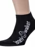 Летние короткие мужские носки, цвет черный, повседневные, шов кеттельный (бесшовная технология), принт (рисунок): надписи, с узором, крупные контрастные рисунки, состав: 80% хлопок, 15% полиамид, 5% эластан, арт. М3-23739. Производитель «ООО Орудьевский трикотаж, Россия» под брендом «Rusocks (орудьевский трикотаж)».