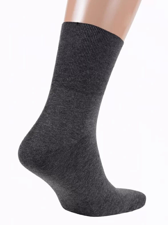 Круглогодичные средней длины мужские носки, цвет темно-серый, медицинские, классические, шов кеттельный (бесшовная технология), принт (рисунок): однотонный, без рисунков/узоров, состав: 78% хлопок, 20% полиамид, 2% эластан, арт. М-245. Производитель «ООО Орудьевский трикотаж, Россия» под брендом «Rusocks (орудьевский трикотаж)».