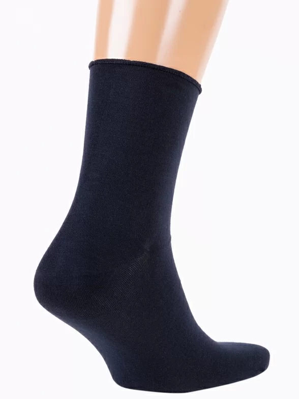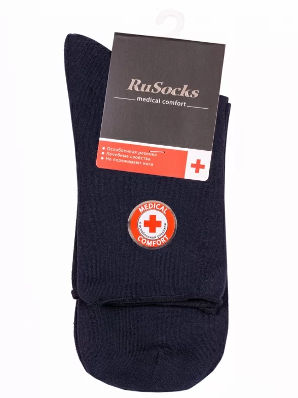 Круглогодичные укороченные мужские носки, цвет темно-синий, медицинские, шов кеттельный (бесшовная технология), принт (рисунок): однотонный, без рисунков/узоров, состав: 75% хлопок, 23% полиамид, 2% эластан, арт. М3-13034. Производитель «ООО Орудьевский трикотаж, Россия» под брендом «Rusocks (орудьевский трикотаж)».