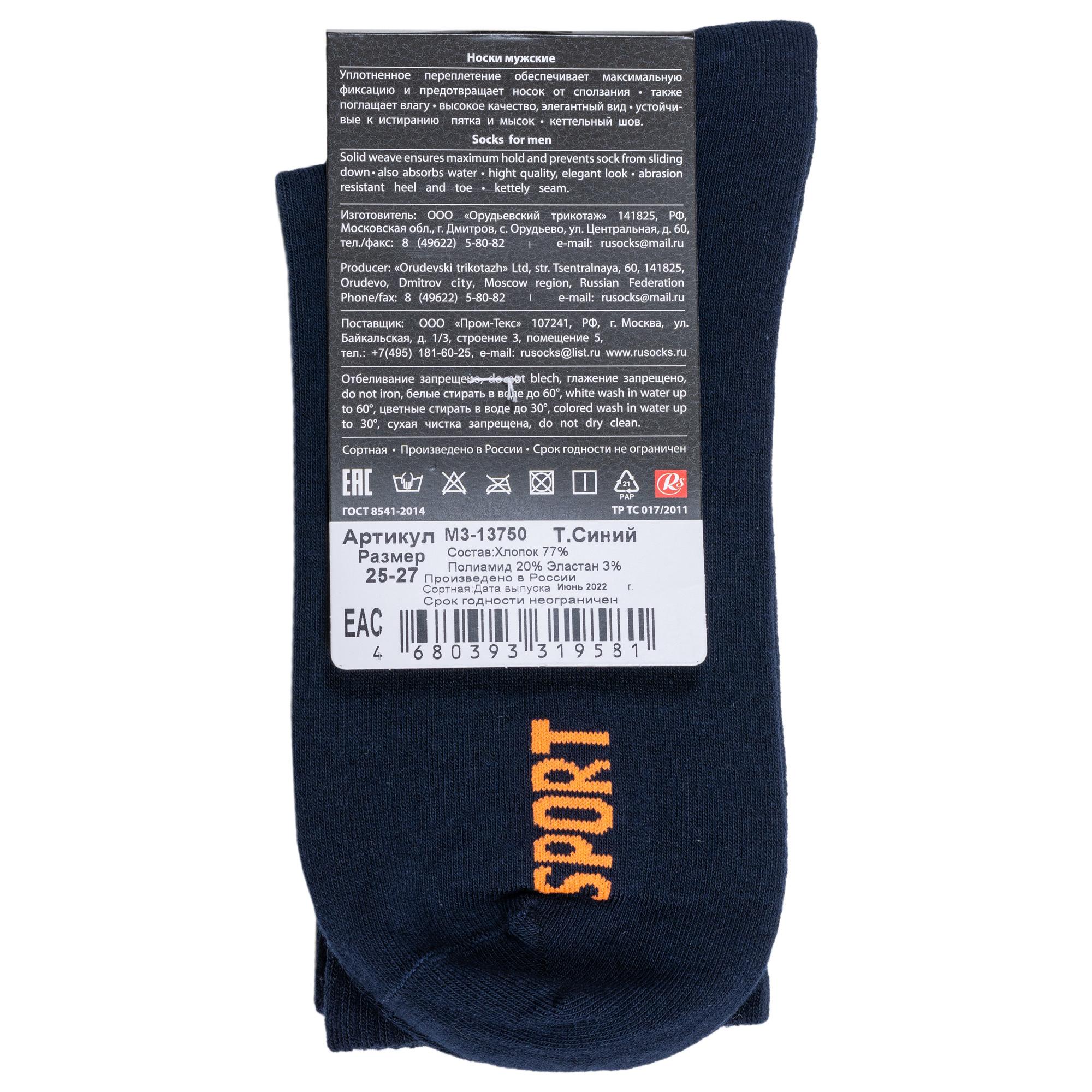 Круглогодичные средней длины мужские носки, цвет темно-синий, спортивные, шов кеттельный (бесшовная технология), принт (рисунок): спортивные, в рубчик, однотонный, небольшой рисунок, состав: 77% хлопок, 20% полиамид, 3% эластан, арт. М3-13750. Производитель «ООО Орудьевский трикотаж, Россия» под брендом «Rusocks (орудьевский трикотаж)».