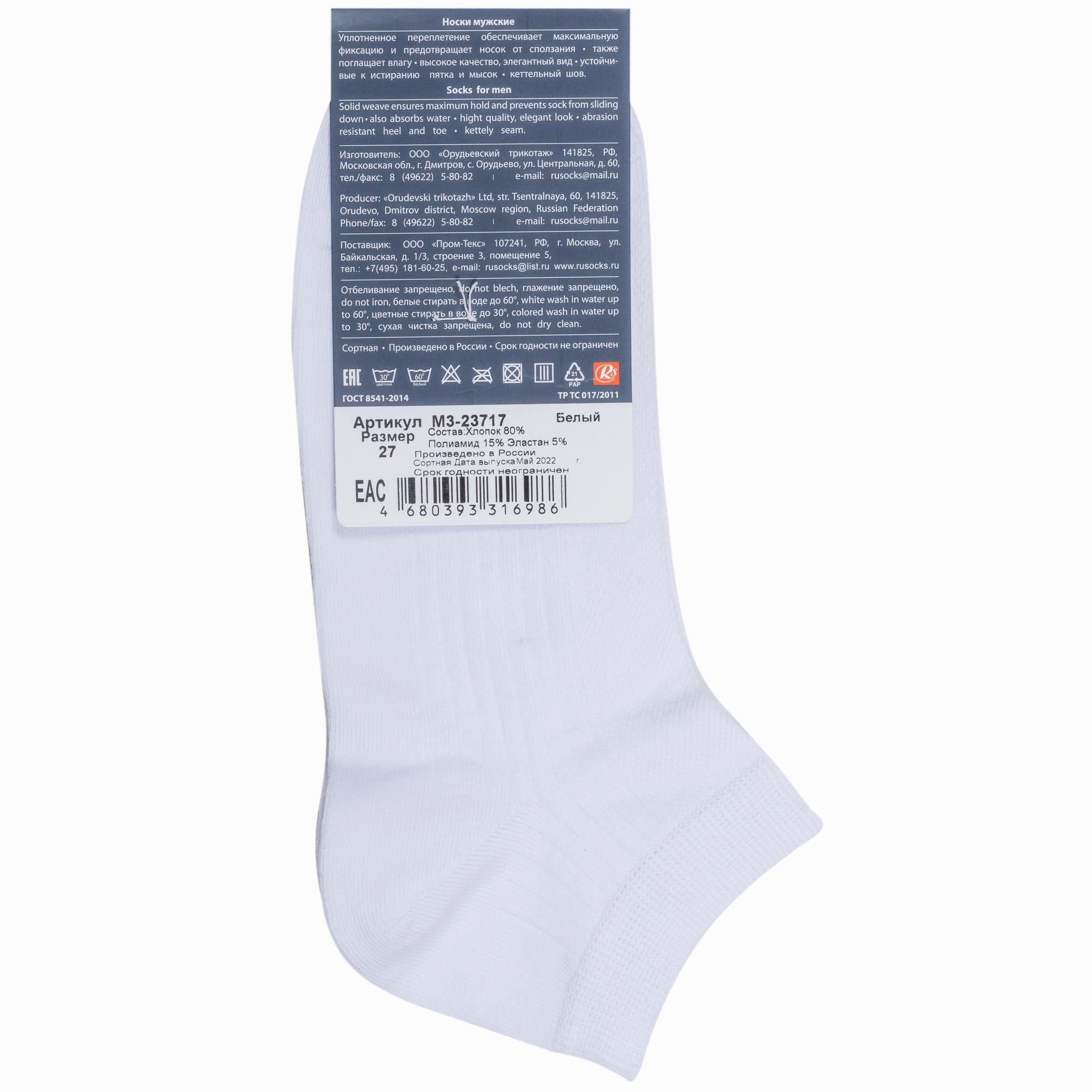 Летние короткие мужские носки, цвет белый, в сеточку, спортивные, классические, шов кеттельный (бесшовная технология), принт (рисунок): спортивные, в рубчик, однотонный, состав: 78% хлопок, 20% полиамид, 2% эластан, арт. М3-23717. Производитель «ООО Орудьевский трикотаж, Россия» под брендом «Rusocks (орудьевский трикотаж)».