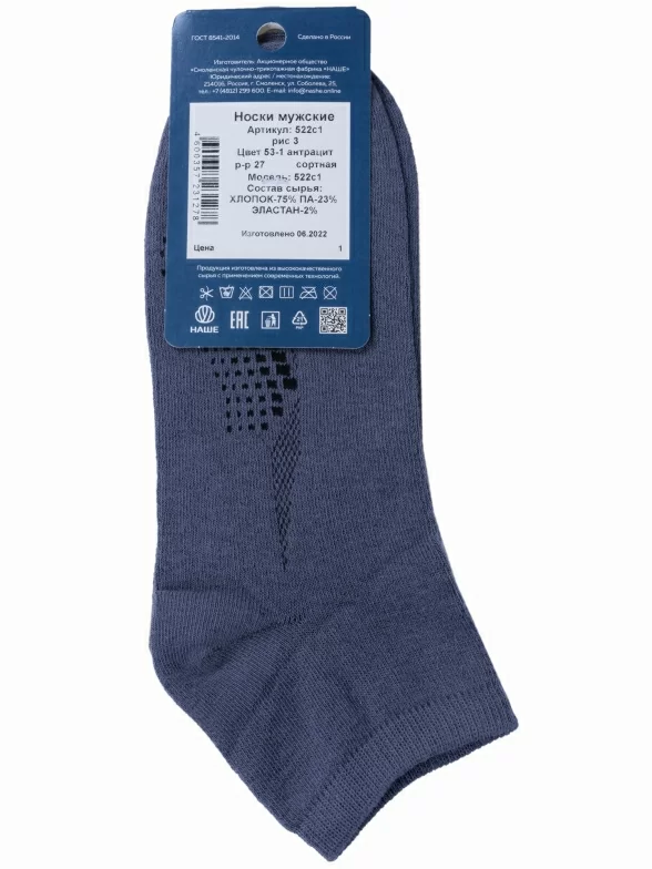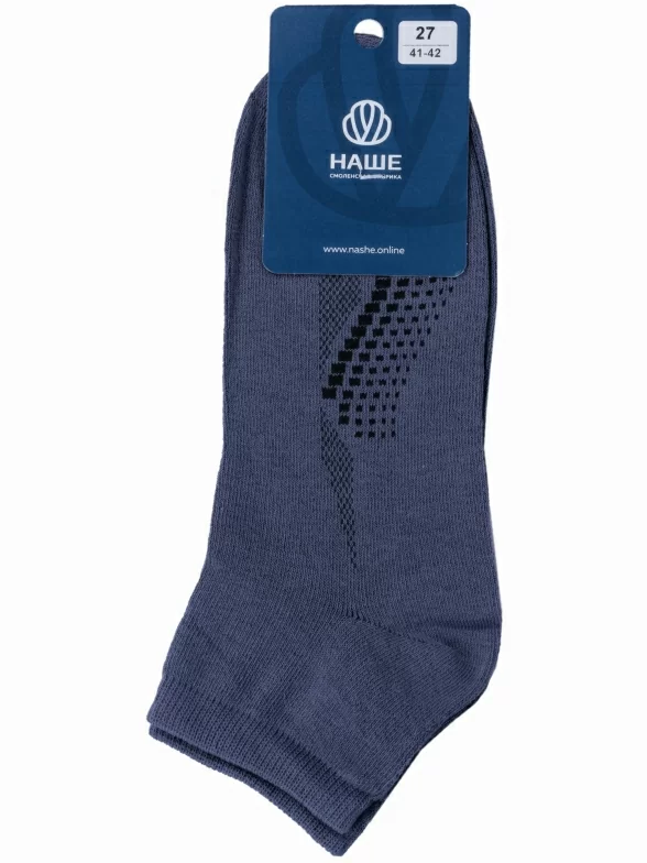 Летние короткие мужские носки, цвет темно-серый, в сеточку, спортивные, шов обычный (не бесшовные), принт (рисунок): спортивные, однотонный, состав: 75% хлопок, 23% полиамид, 2% эластан, арт. 522С1-3. Производитель «Смоленская чулочная фабрика, Россия» под брендом «Наше смоленской чулочной фабрики».