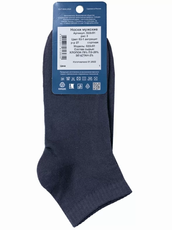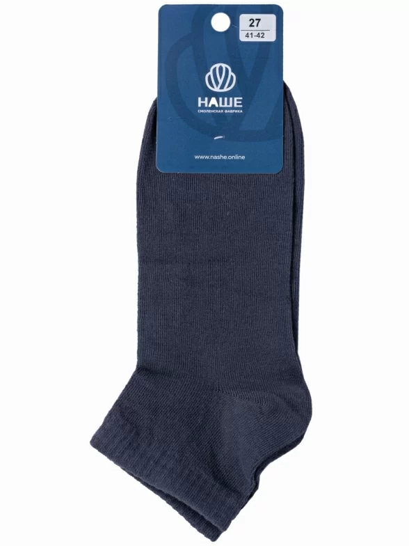 Летние или круглогодичные короткие мужские носки, цвет темно-серый, классические, шов обычный (не бесшовные), принт (рисунок): однотонный, без рисунков/узоров, состав: 78% хлопок, 20% полиэстер, 2% эластан, арт. 522С51. Производитель «Смоленская чулочная фабрика, Россия» под брендом «Наше смоленской чулочной фабрики».