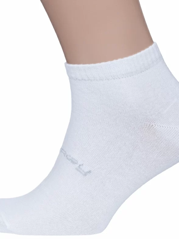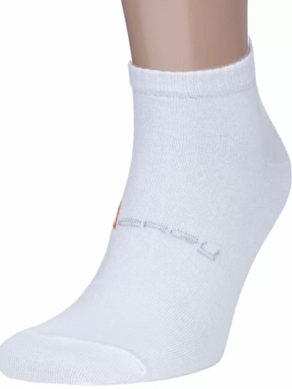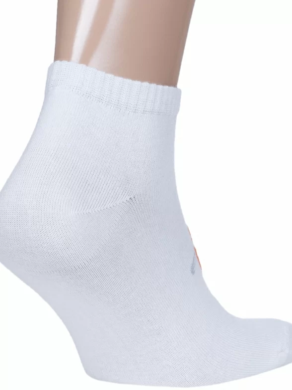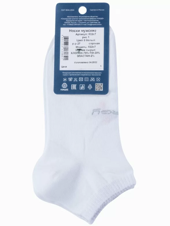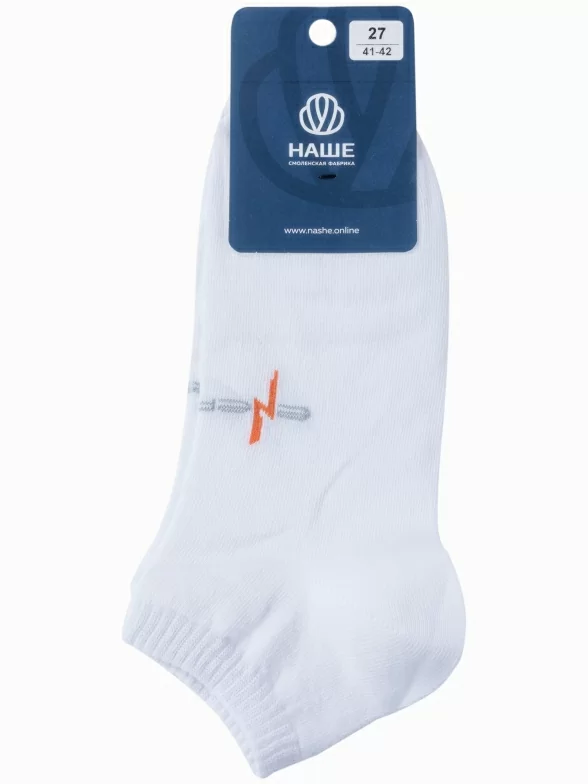 Круглогодичные или летние короткие мужские носки, цвет белый, спортивные, шов обычный (не бесшовные), принт (рисунок): спортивные, с узором, состав: 78% хлопок, 20% полиэстер, 2% эластан, арт. 522С7. Производитель «Смоленская чулочная фабрика, Россия» под брендом «Наше смоленской чулочной фабрики».