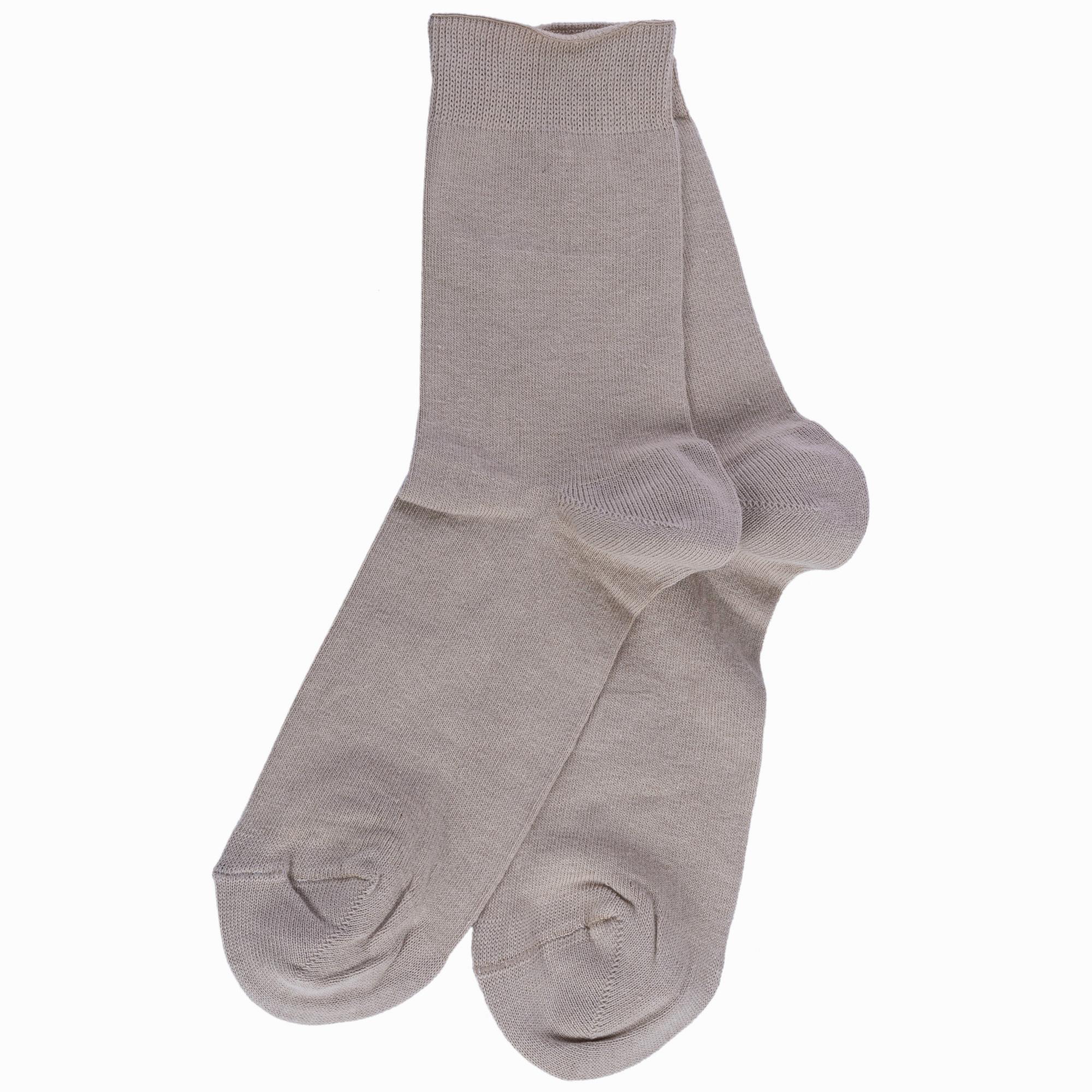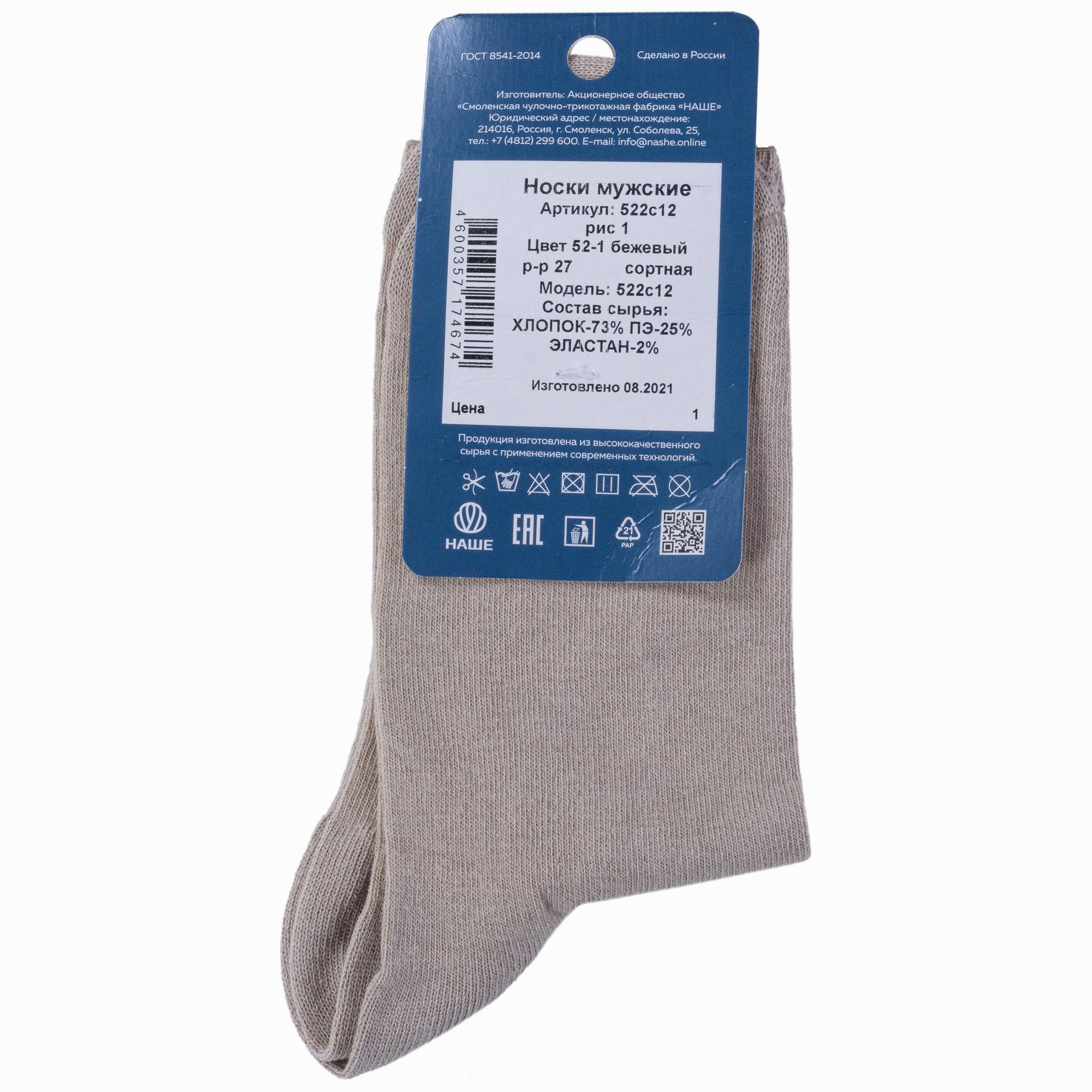 Круглогодичные средней длины мужские носки, цвет бежевый, классические, шов обычный (не бесшовные), принт (рисунок): однотонный, без рисунков/узоров, состав: 73% хлопок, 25% полиэстер, 2% эластан, арт. 522С12. Производитель «Смоленская чулочная фабрика, Россия» под брендом «Наше смоленской чулочной фабрики».
