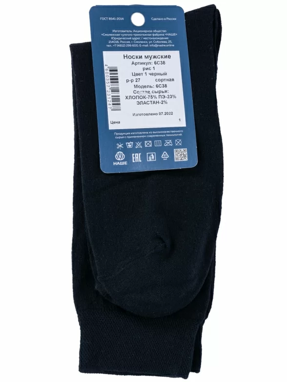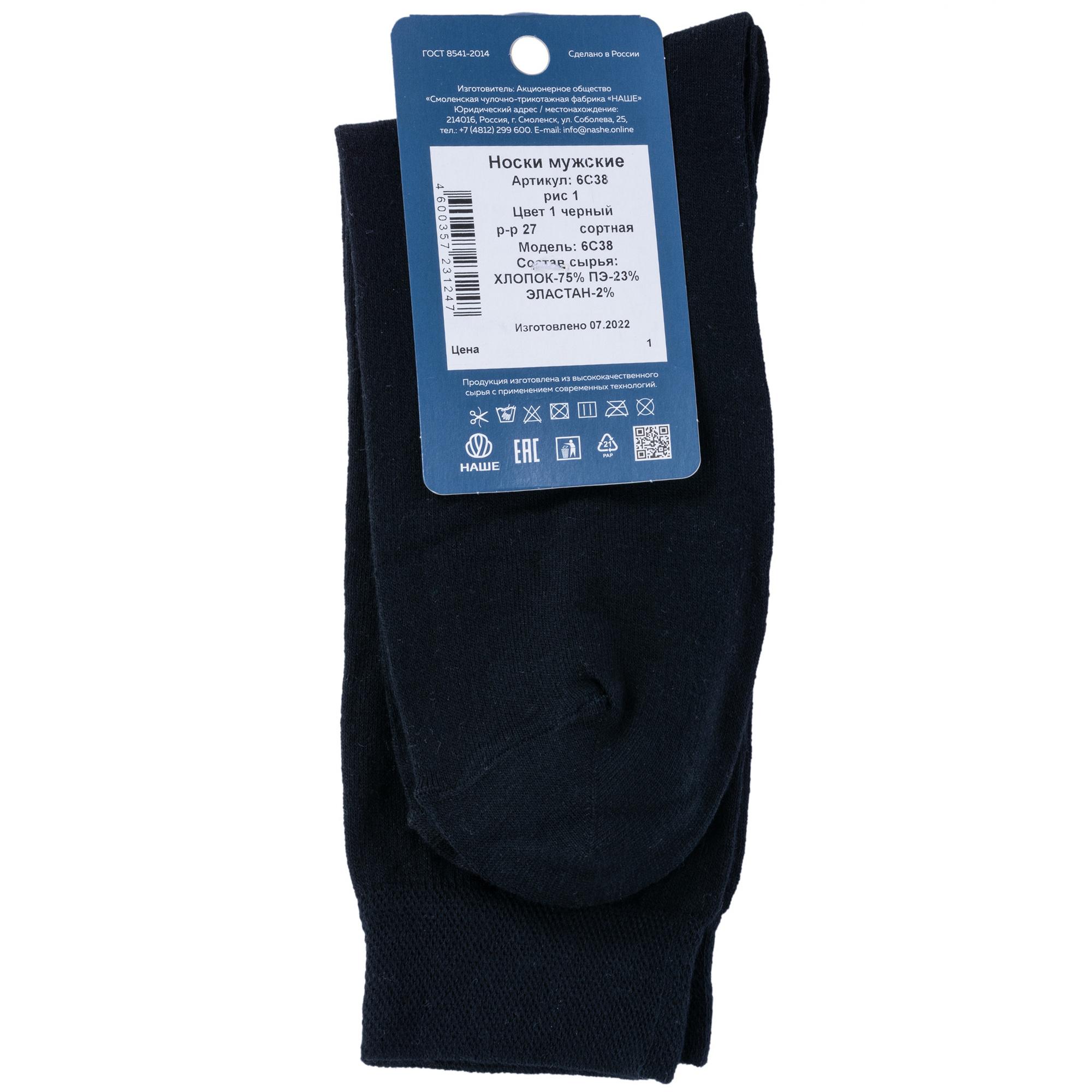 Круглогодичные средней длины мужские носки, цвет черный, классические, шов обычный (не бесшовные), принт (рисунок): небольшой рисунок, однотонный, состав: 75% хлопок, 23% полиэстер, 2% эластан, арт. 6С38. Производитель «Смоленская чулочная фабрика, Россия» под брендом «Наше смоленской чулочной фабрики».
