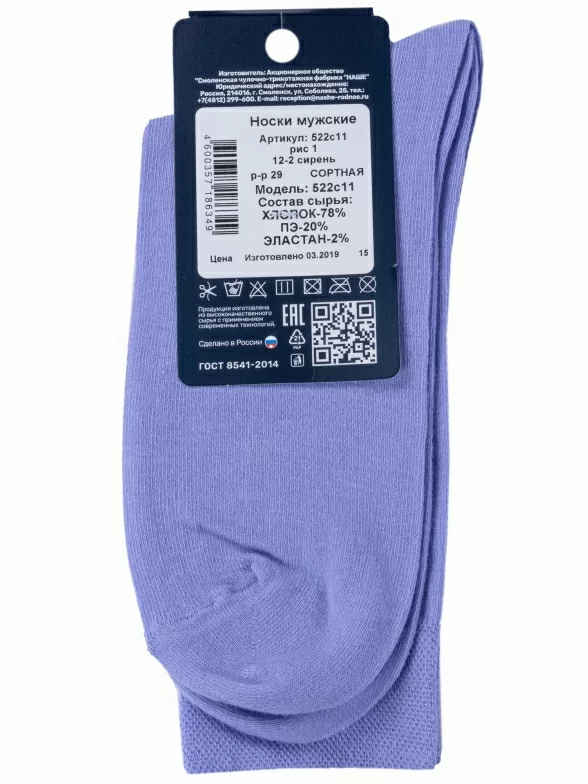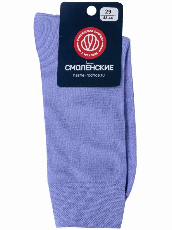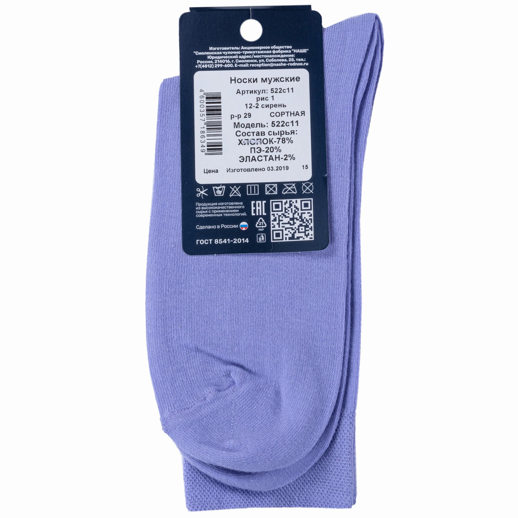 Круглогодичные средней длины мужские носки, цвет сиреневый, классические, шов обычный (не бесшовные), принт (рисунок): без рисунков/узоров, однотонный, состав: 78% хлопок, 20% полиэстер, 2% эластан, арт. 522С11. Производитель «Смоленская чулочная фабрика, Россия» под брендом «Наше смоленской чулочной фабрики».