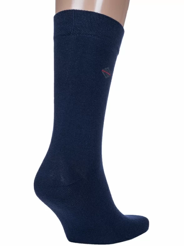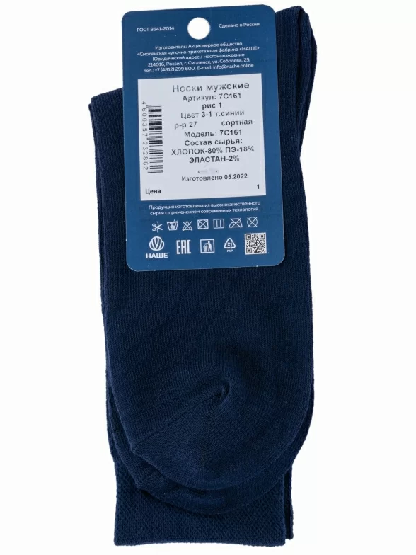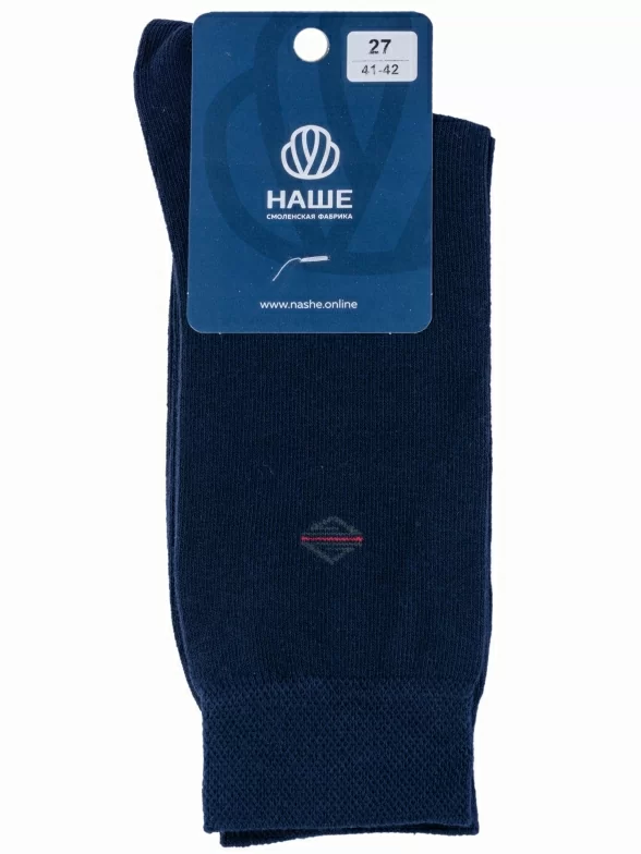 Круглогодичные средней длины мужские носки, цвет темно-синий, классические, шов обычный (не бесшовные), принт (рисунок): однотонный, небольшой рисунок, состав: 80% хлопок, 18% полиамид, 2% эластан, арт. 7С161. Производитель «Смоленская чулочная фабрика, Россия» под брендом «Наше смоленской чулочной фабрики».