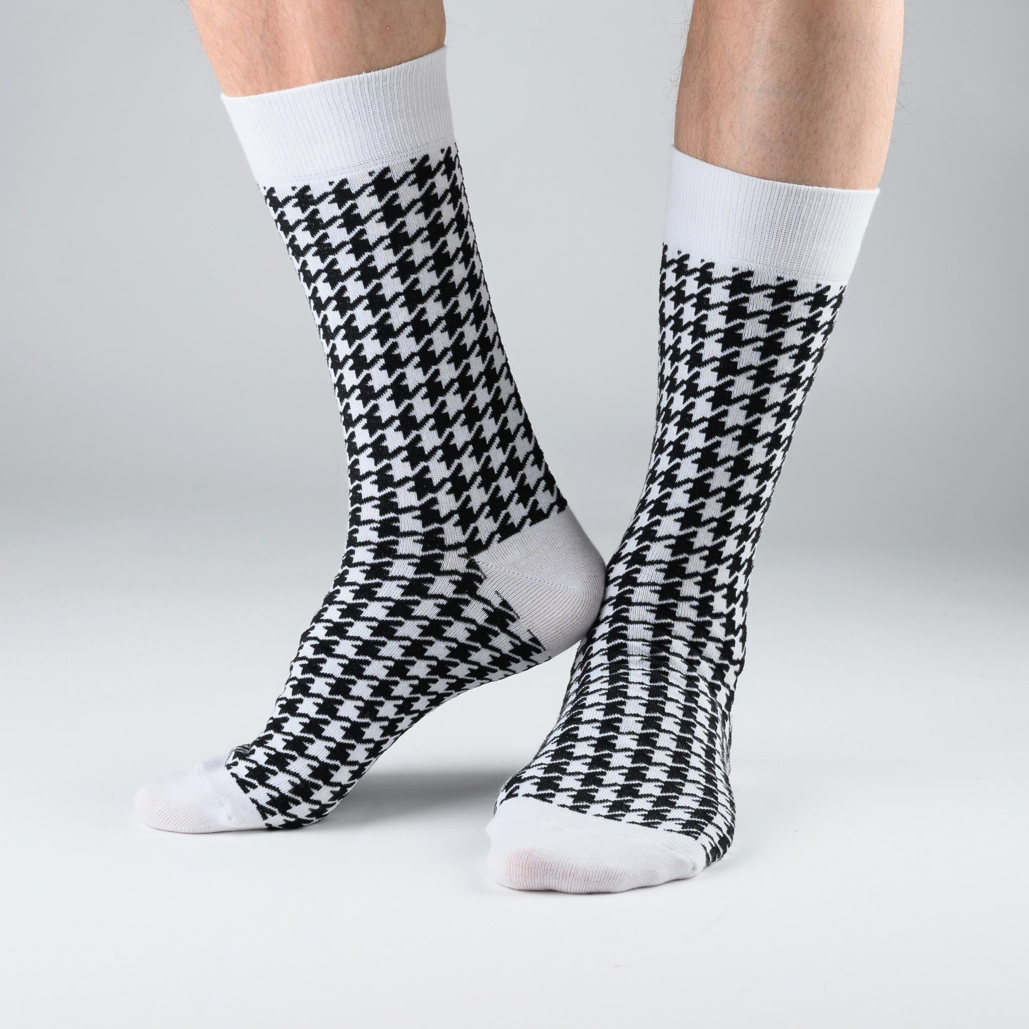 Круглогодичные средней длины мужские носки, цвет черный-белый, классические, шов обычный (не бесшовные), принт (рисунок): геометрия, с узором, состав: 80% хлопок, 17% полиамид, 3% лайкра (эластан), арт. VO9. Производитель «ООО «Чулочно-носочная фабрика «Нева-Сокс», Ленинградская обл, Россия» под брендом «Нева-сокс».