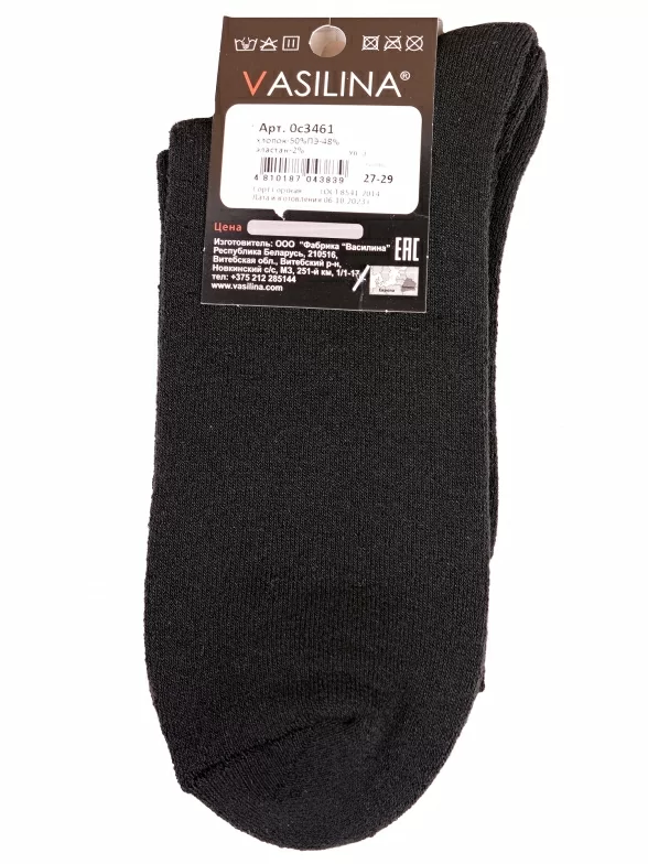 Круглогодичные укороченные мужские носки, цвет черный, классические, состав: 50% хлопок, 48% полиэстер, 2% эластан, арт. 0с3461. Производитель «ООО Фабрика Василина, Беларусь» под брендом «Vasilina».